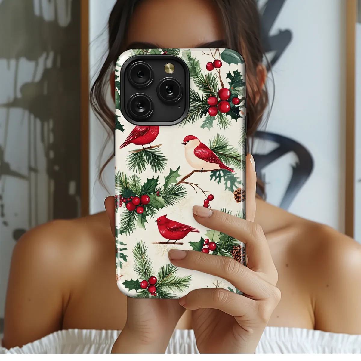 Christmas Cardinal Bird Holly Berry Pattern Phone Case Cover for iPhone 17 Pro Max 16 15 Plus 14 13 Mini Samsung S25 S24 Pixel 10 9 8287
