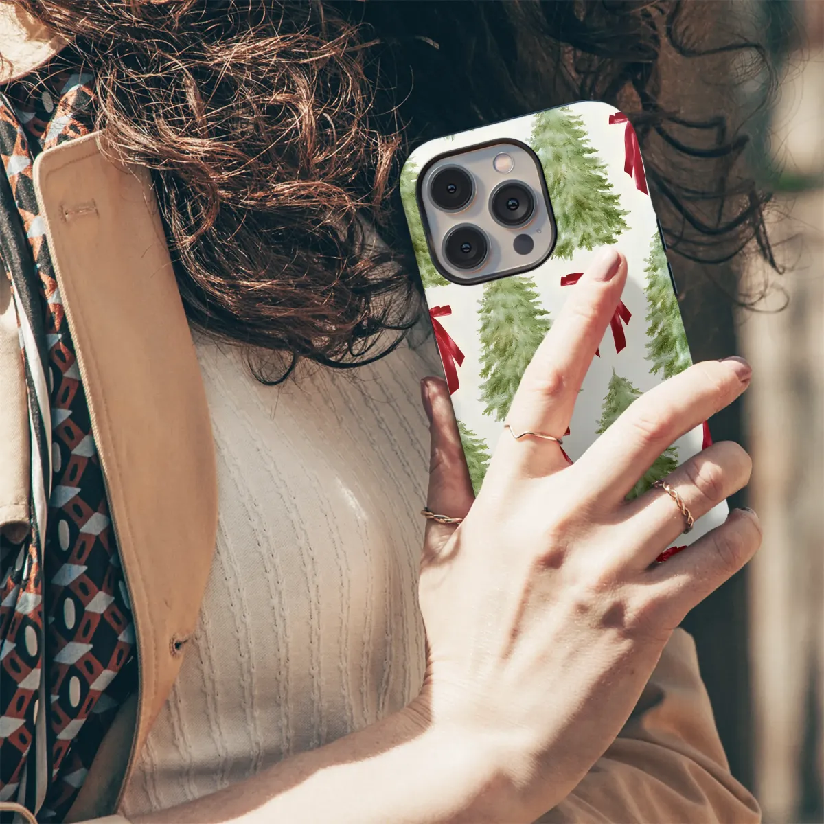 Wrap your daily essentials in the magic of the season with a design that feels like a classic Christmas card come to life. Picture a serene winter forest, where snow-dusted pine trees stand tall and proud, captured in beautiful watercolor detail. Each evergreen is unique, painted in soft, gentle green hues that evoke a crisp, woodland calm. Scattered playfully between the trees are vibrant, scarlet red bows, their ribbons cascading as if tied perfectly just for you. This timeless pairing of rich red and forest green against a soft, creamy backdrop creates an immediate feeling of warmth, nostalgia, and sophisticated festive cheer. This is more than just a pretty pattern; it’s a little piece of holiday art that brings the cozy joy of Christmas into your everyday life, a small celebration you can carry with you. This elegant and artistic accessory is the perfect way to showcase your love for the most wonderful time of the year, and it makes a thoughtful stocking stuffer or secret Santa gift for anyone who adores traditional holiday charm. Let this classic winter scene add a touch of yuletide spirit to your style, reminding you of carol singing, crackling fires, and the simple, profound beauty of a Christmas forest.