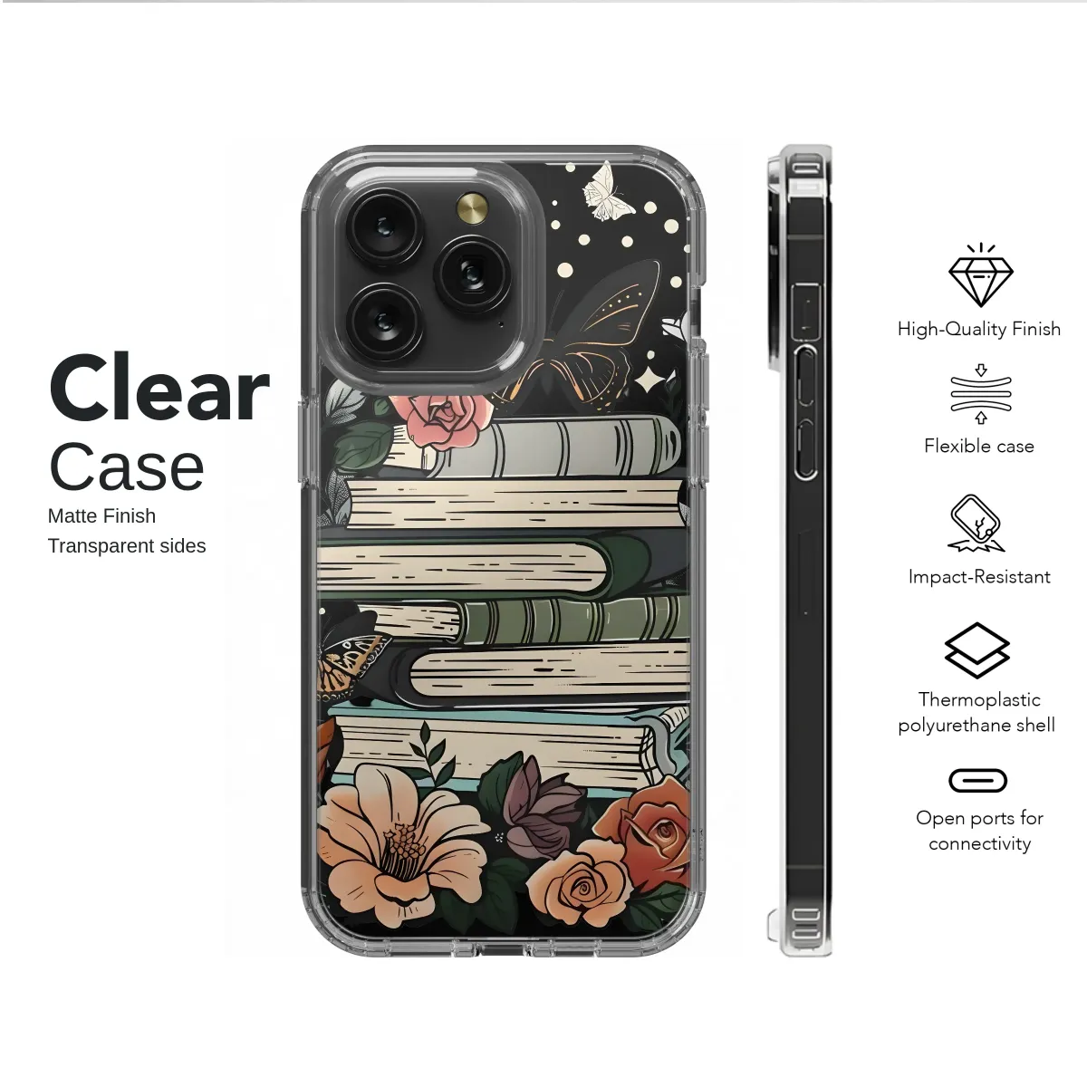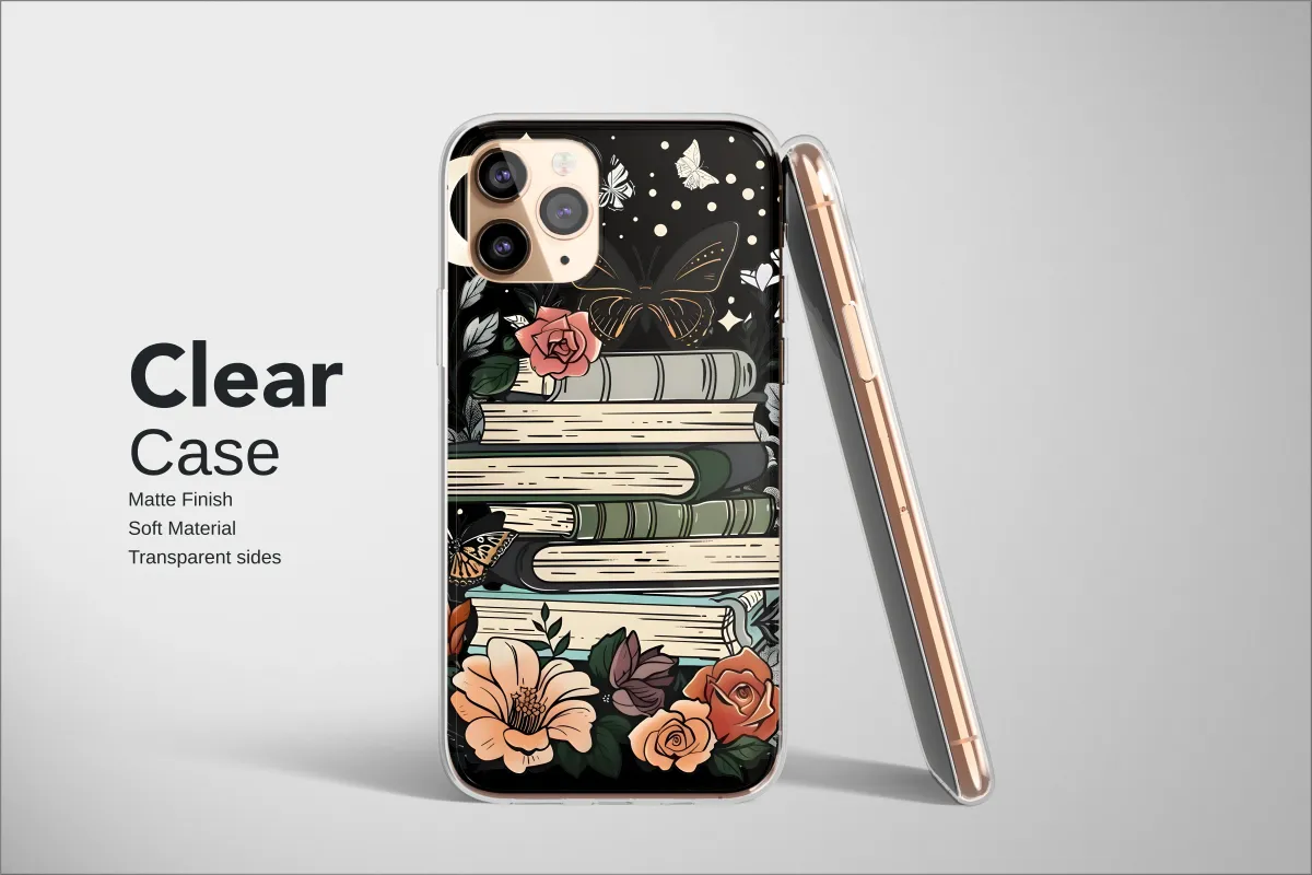Clear Clear Celestial Floral Book Stack with Butterflies Graphic Phone Case Cover for iPhone 17 Pro Max 16 15 13 Samsung S25 S24 Pixel 9363