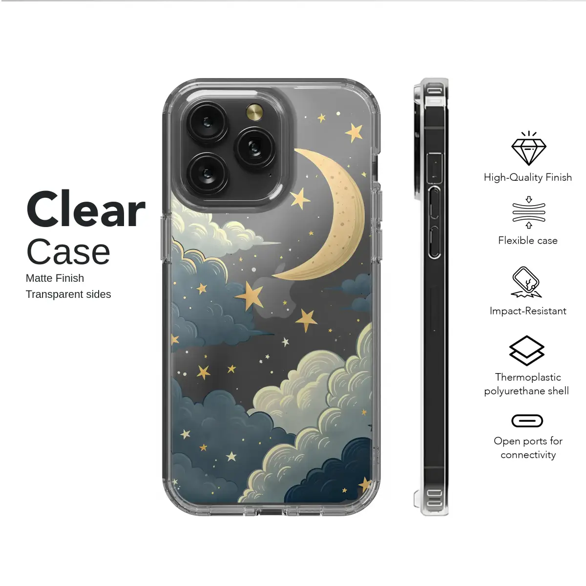 Clear Clear Celestial Night Sky with Moon and Stars Illustration Phone Case Cover for iPhone 17 Pro Max 16 15 13 Samsung S26 S25 Pixel 10016