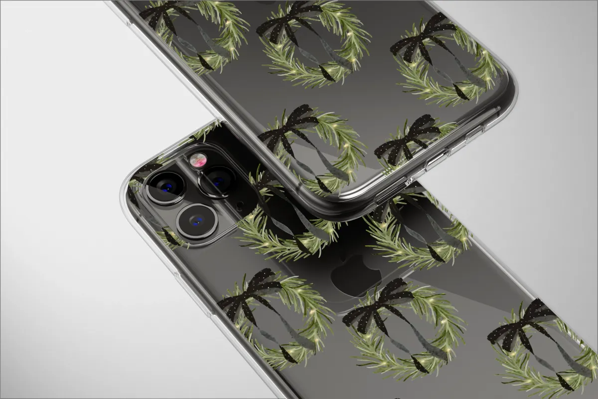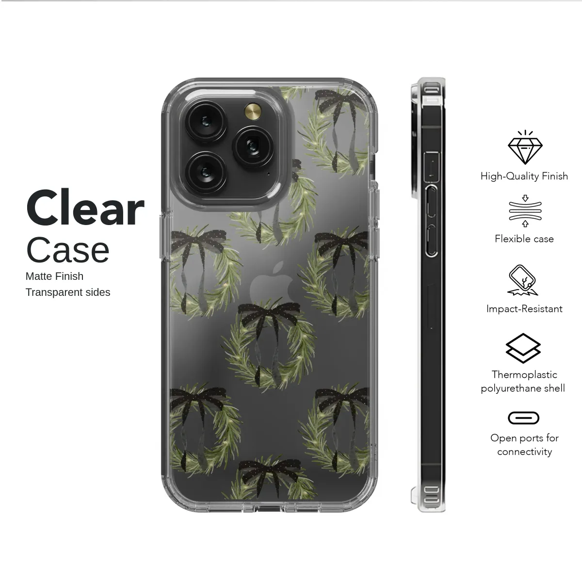 Clear Clear Christmas Wreath Pattern with Black Polka Dot Bow Phone Case Cover for iPhone 17 Pro Max 16 15 13 Samsung S25 S24 Pixel 8634 - Image 1