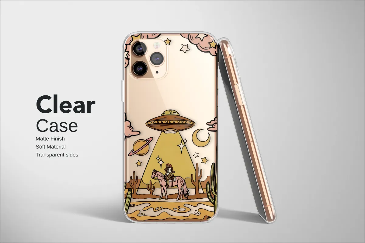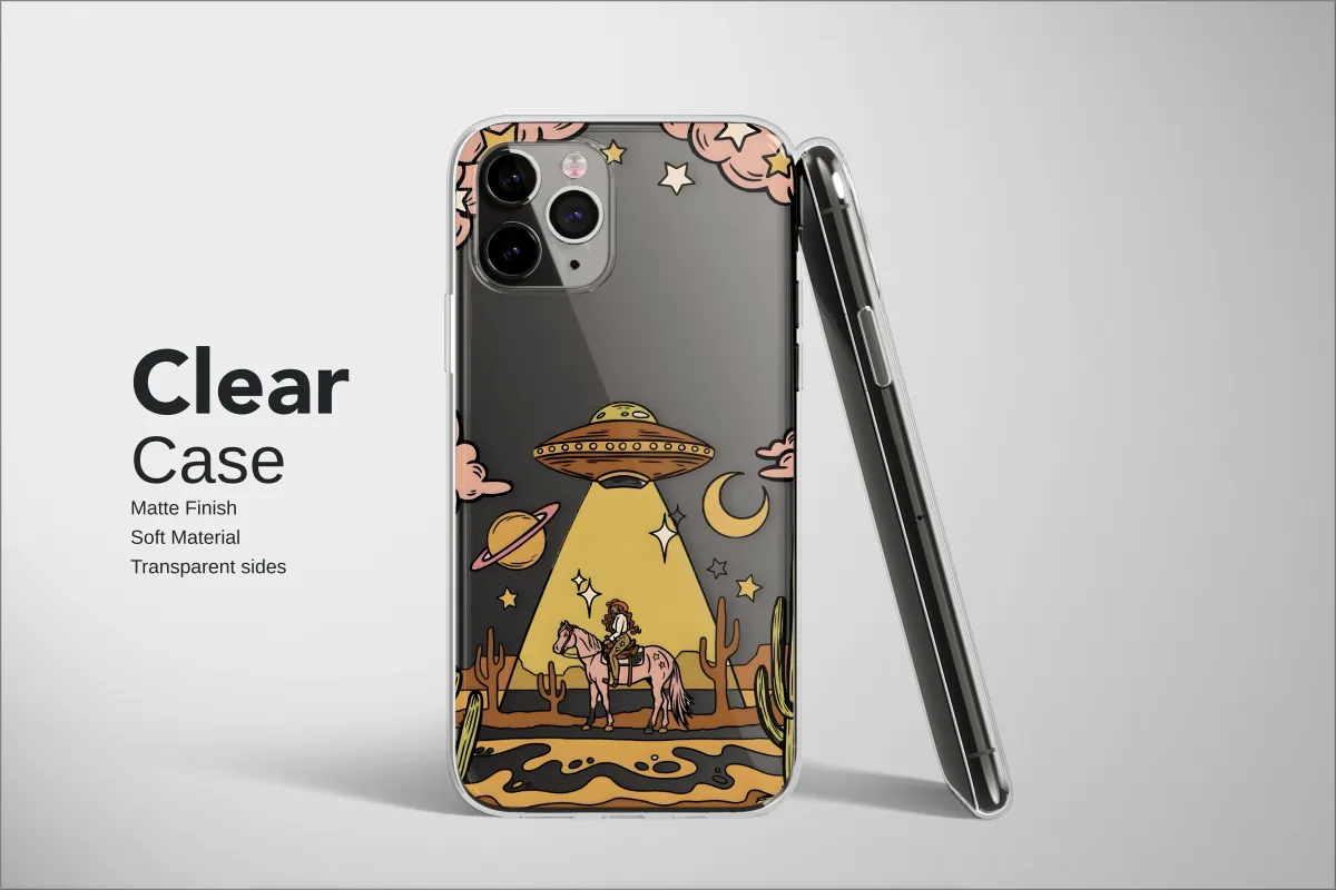 Clear Clear Cosmic Cowgirl UFO Desert Scene Phone Case Cover for iPhone 17 Pro Max 16 15 Plus 14 13 Mini SE Samsung S26 S25 Google Pixel 10 9 9427