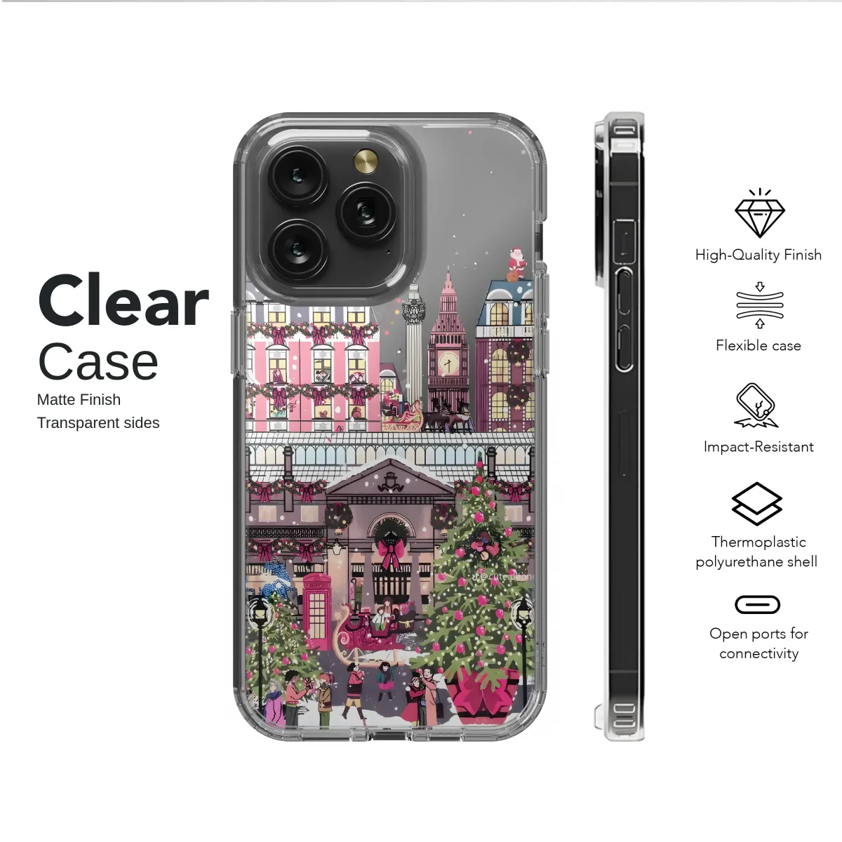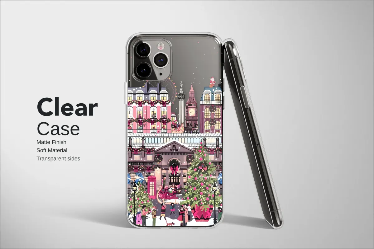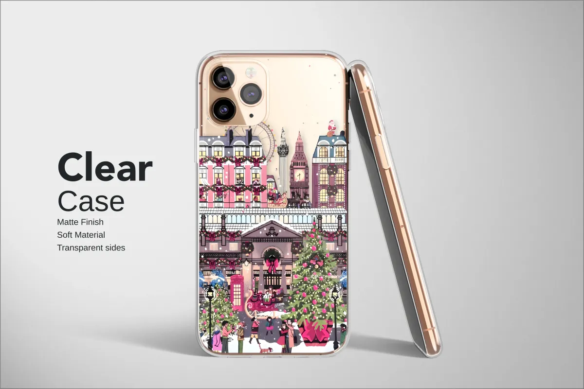 Clear Clear Festive London Christmas Illustrated Cityscape Phone Case Cover for iPhone 17 Pro Max 16 15 13 Samsung S25 S24 Pixel 8560