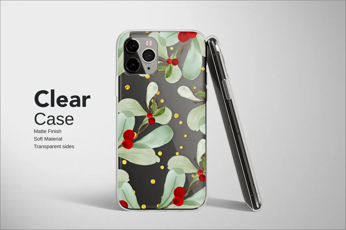 Clear Clear Festive Mistletoe Watercolor with Gold Glitter Stripes Phone Case Cover for iPhone 17 Pro Max 16 15 13 Samsung S25 S24 Pixel 8433