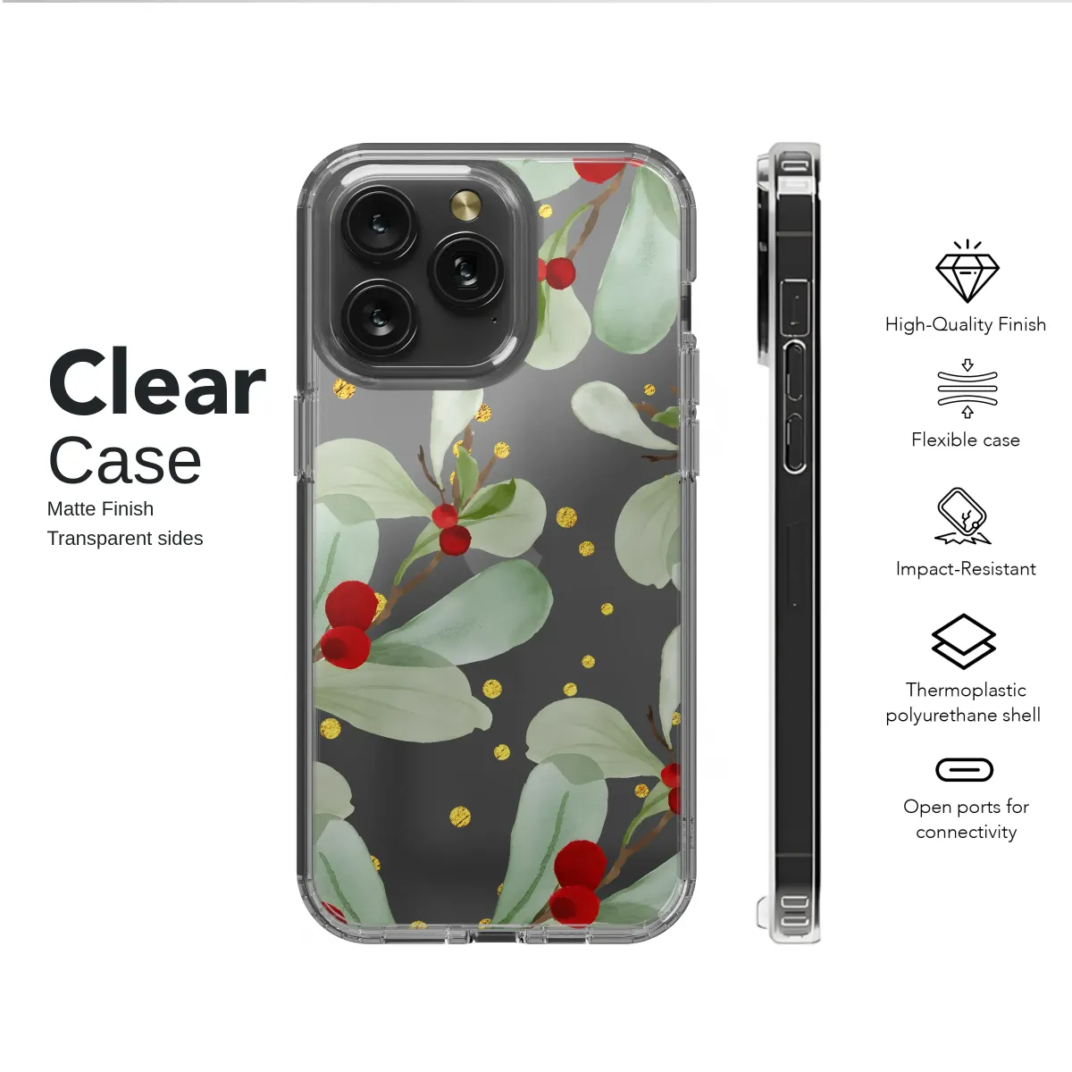 Clear Clear Festive Mistletoe Watercolor with Gold Glitter Stripes Phone Case Cover for iPhone 17 Pro Max 16 15 13 Samsung S25 S24 Pixel 8433 - Image 1