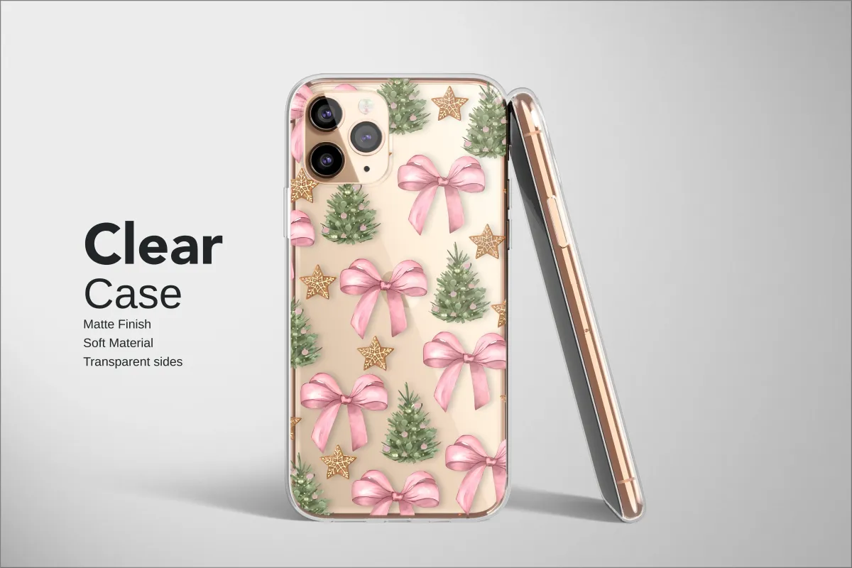 Clear Clear Festive Pink Bow Christmas Tree Stripe Art Phone Case Cover for iPhone 17 Pro Max 16 15 13 Samsung S25 S24 Pixel 8538