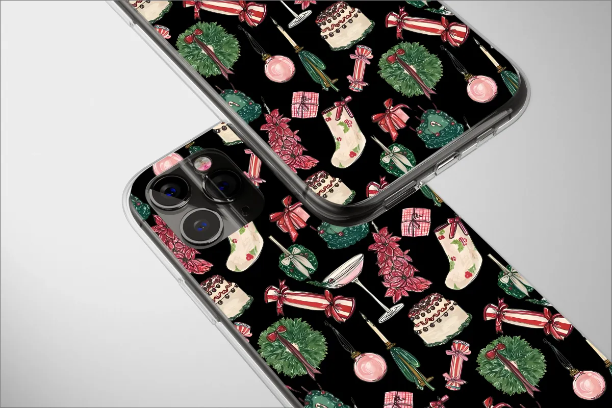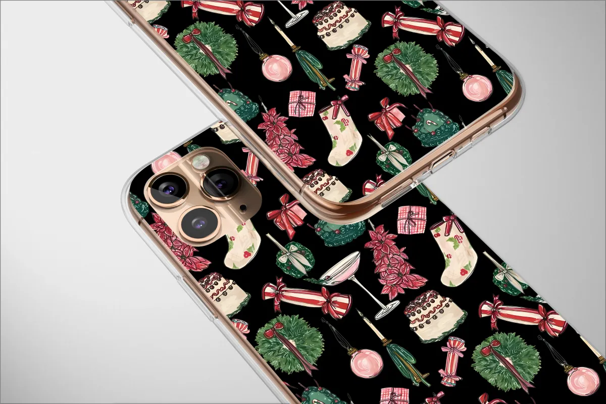 Embrace the holiday spirit with a unique twist. This festive design features a vibrant collage of classic Christmas illustrations, including charming stockings, elegant wreaths, sweet cakes, and celebratory cocktails. Rendered in a whimsical, hand-drawn style, these nostalgic elements pop against a modern, colorful glitch art background, creating a bold and cheerful pattern perfect for the season.