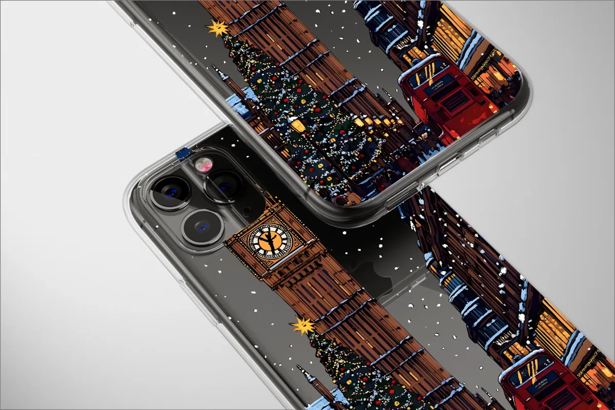 Capture the festive spirit of a London winter with this unique glitch art phone case. The design features a snowy Christmas scene with iconic Big Ben, a classic red double-decker bus, and a beautifully decorated tree, all rendered in a striking, modern digital art style. Inspired by the intersection of classic cityscapes and digital aesthetics, this case is perfect for anyone who loves London, travel, or unique, artistic accessories. It's a stylish way to protect your phone while showcasing a piece of contemporary art. Key Features: • Vibrant Artwork: High-resolution, UV-printed design ensures the colors are bright and won't fade. • Durable Protection: Made from a hybrid Thermoplastic Polyurethane (TPU) and Polycarbonate (PC) material for robust shock absorption. • Slim Profile: A lightweight, sleek design that doesn't add bulk, with a comfortable grip. • Functional Design: Precise cutouts provide easy access to all buttons, ports, and camera functions. Available for most iPhone and Samsung Galaxy models. Please select your device from the dropdown menu. To clean, wipe gently with a soft, damp cloth.