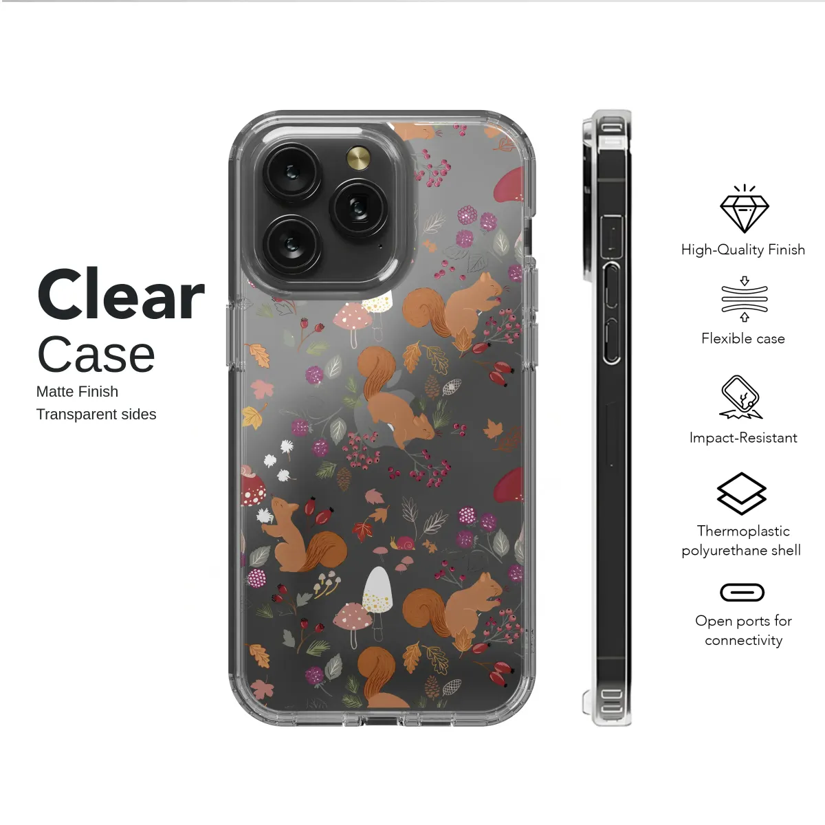Clear Clear Glitch Art Woodland Squirrel Mushroom Pattern Phone Case Cover for iPhone 17 Pro Max 16 15 13 Samsung S25 S24 Pixel 9069
