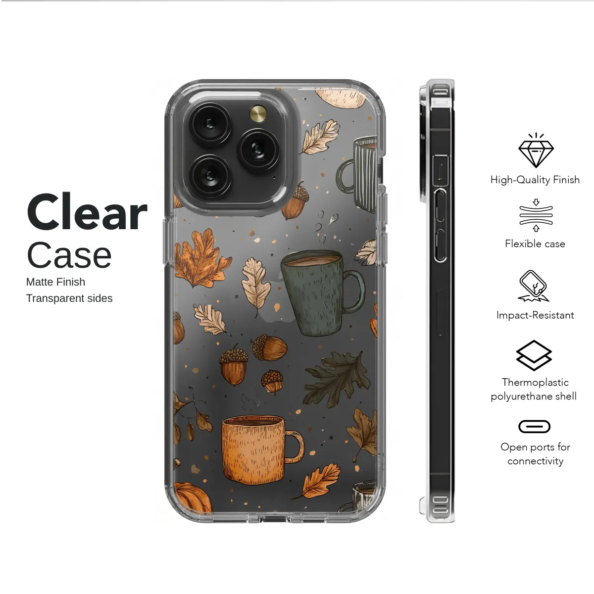 Clear Clear Glitchy Autumn Coffee Pattern Pumpkin Acorn Phone Case Cover for iPhone 17 Pro Max 16 15 13 Samsung S26 S25 Pixel 9524
