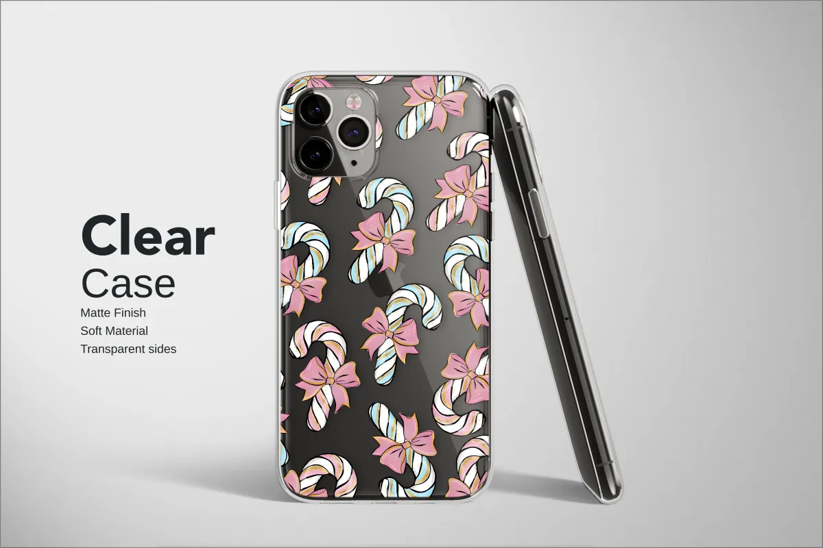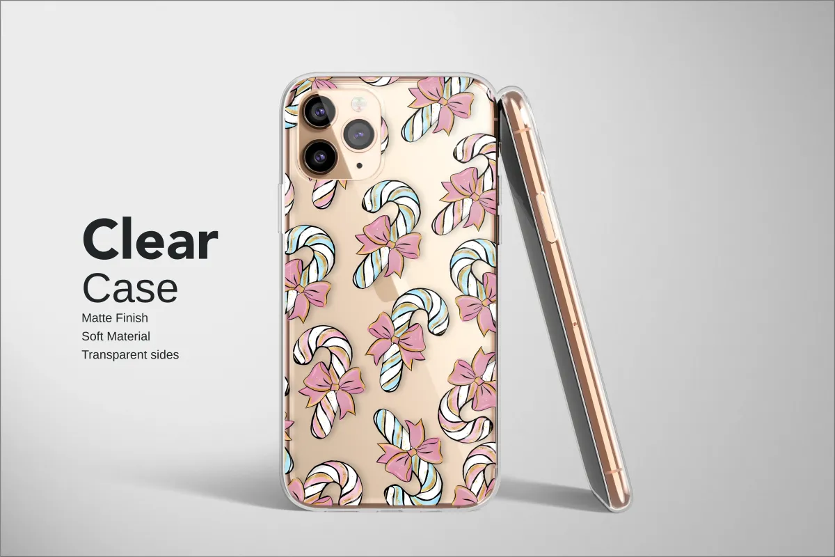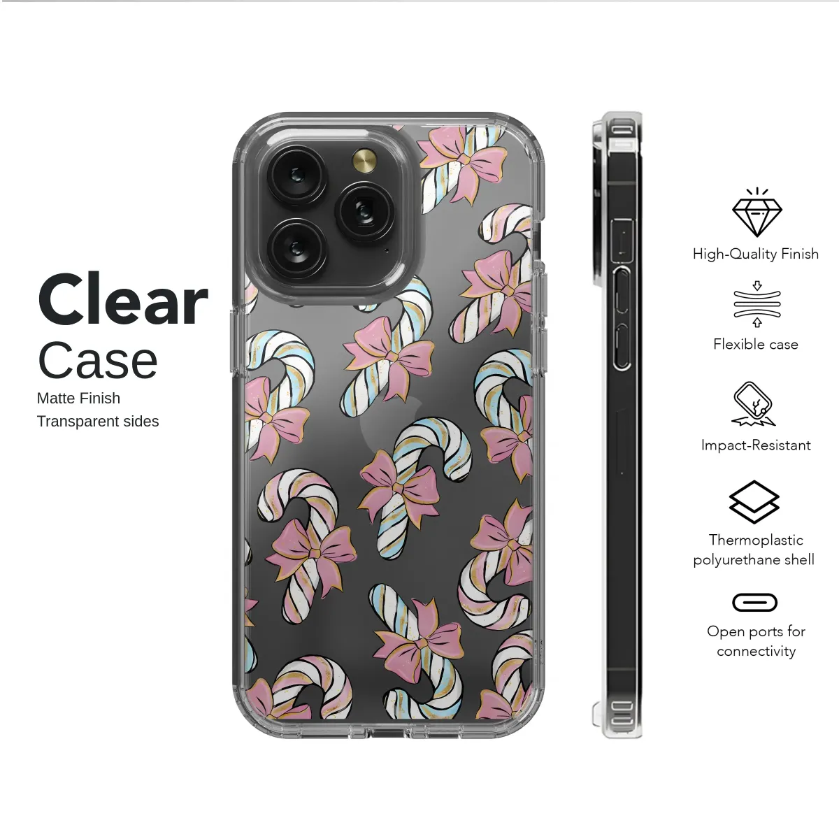 Clear Clear Pastel Candy Cane Art with Pink Bow and Gold Glitter Phone Case Cover for iPhone 17 Pro Max 16 15 13 Samsung S25 S24 Pixel 8495