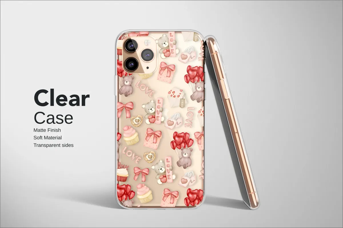 Clear Clear Romantic Teddy Bear and Hearts Watercolor Pattern Phone Case Cover for iPhone 17 Pro Max 16 15 13 Samsung S26 S25 Pixel 9464