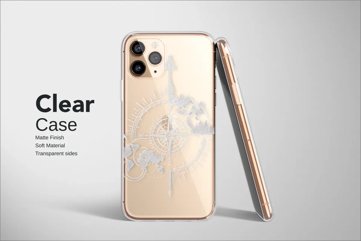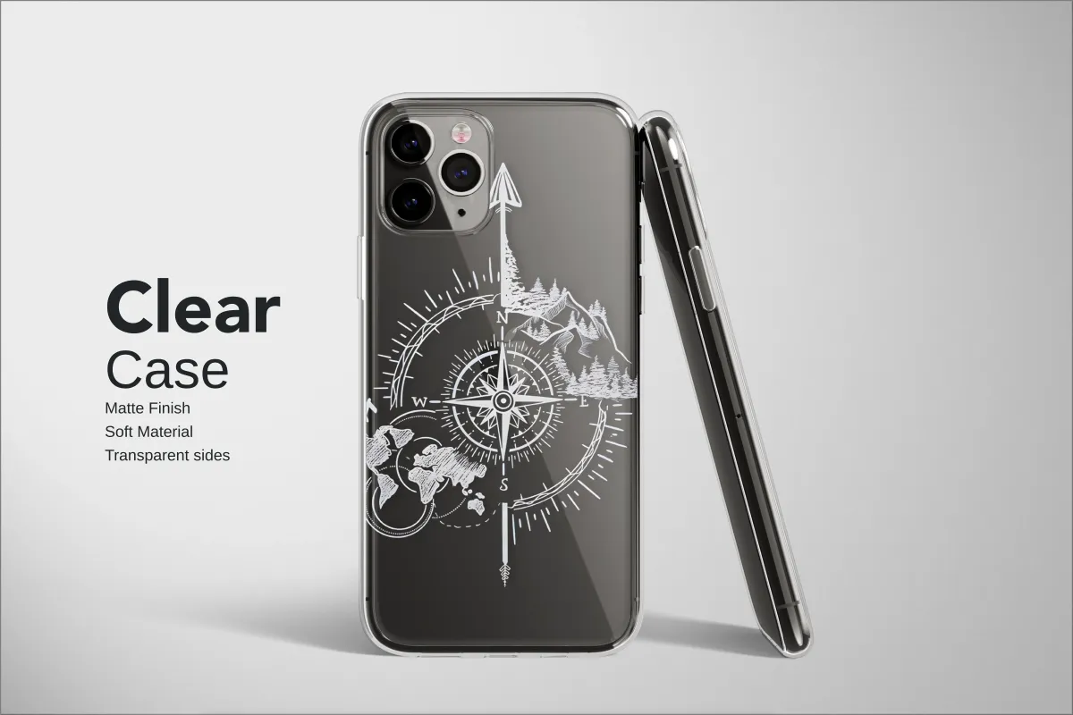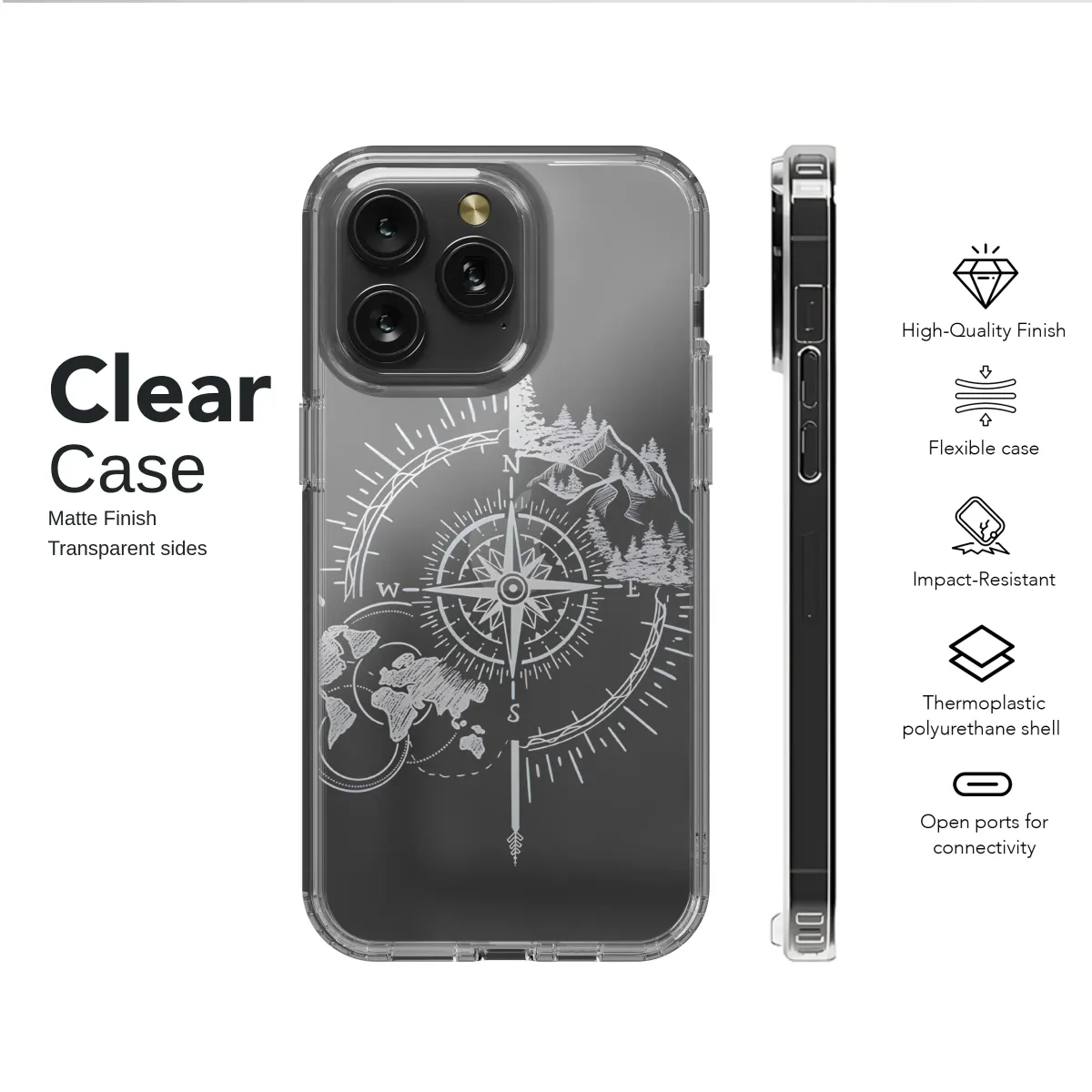 Clear Clear Wanderlust Compass World Map Mountain Sketch Phone Case Cover for iPhone 17 Pro Max 16 15 13 Samsung S25 S24 Pixel 8264