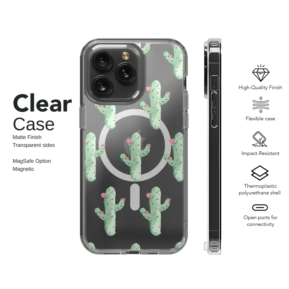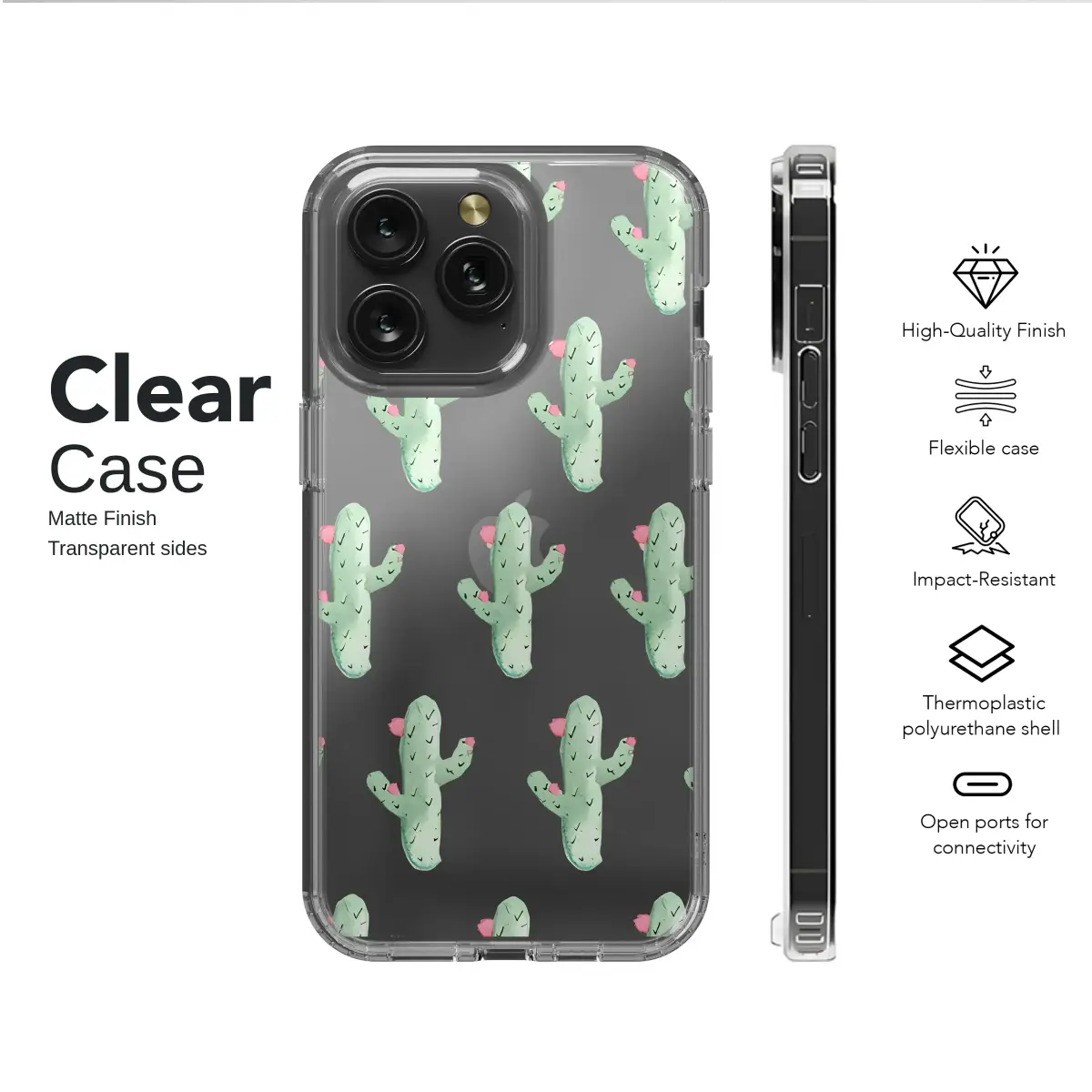 Clear Clear Watercolor Cactus Pattern with Pink Flowers Desert Botanical Phone Case Cover for iPhone 17 15 13 Samsung S26 S25 9918