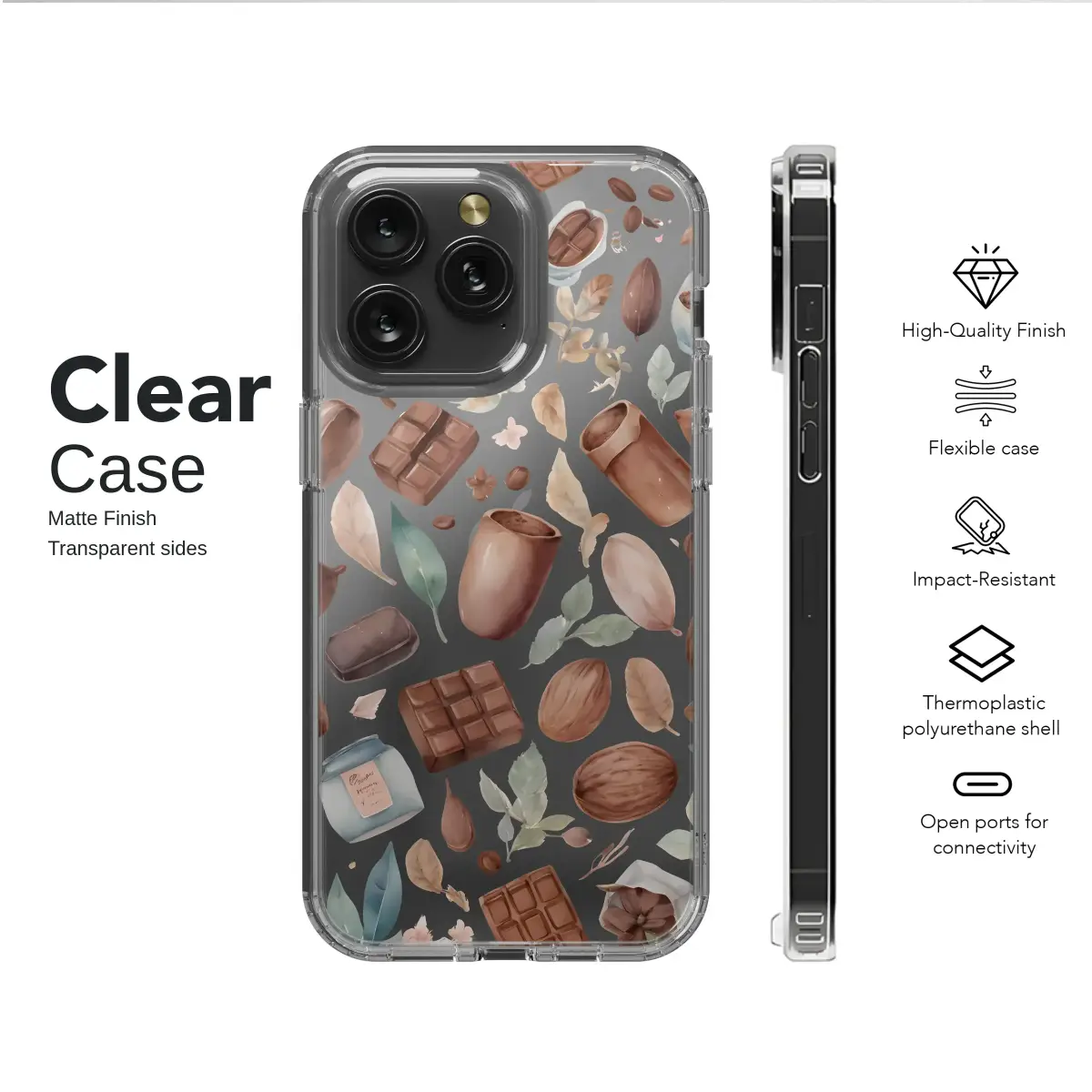 Clear Clear Watercolor Chocolate and Cocoa Bean Botanical Pattern Phone Case Cover for iPhone 17 Pro Max 16 15 13 Samsung S26 S25 Pixel 10133