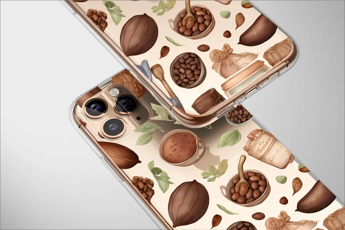 Adorn your accessory with a rich, artistic pattern celebrating the journey from bean to cup. This detailed watercolor design features an array of cacao pods, roasted coffee beans, botanical leaves, and rustic kitchen elements. The warm, earthy tones and vintage illustration style create a cozy and sophisticated look perfect for any coffee or chocolate enthusiast.