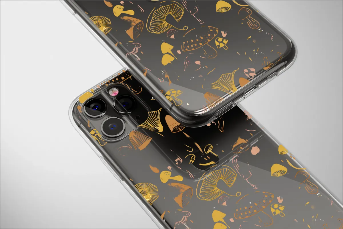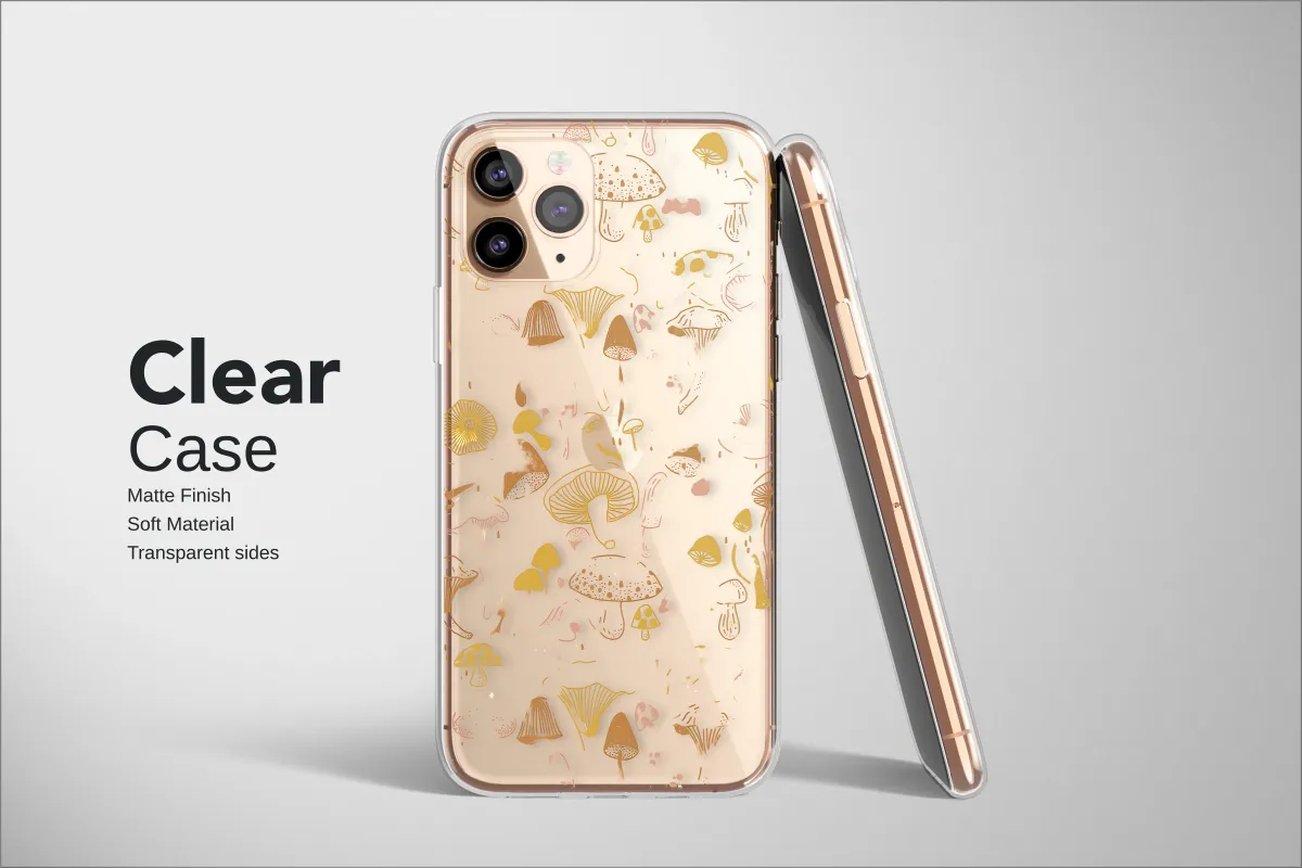 Clear Clear Whimsical Golden Mushroom Pattern Glitter Art Phone Case Cover for iPhone 17 Pro Max 16 15 13 Samsung S25 S24 Pixel 8209