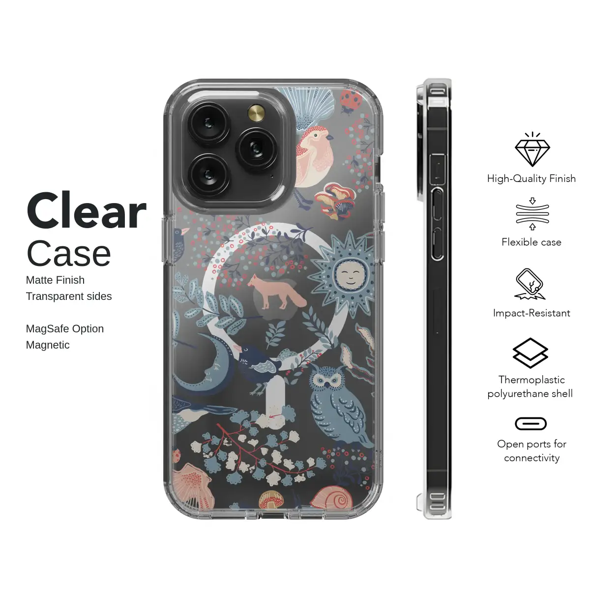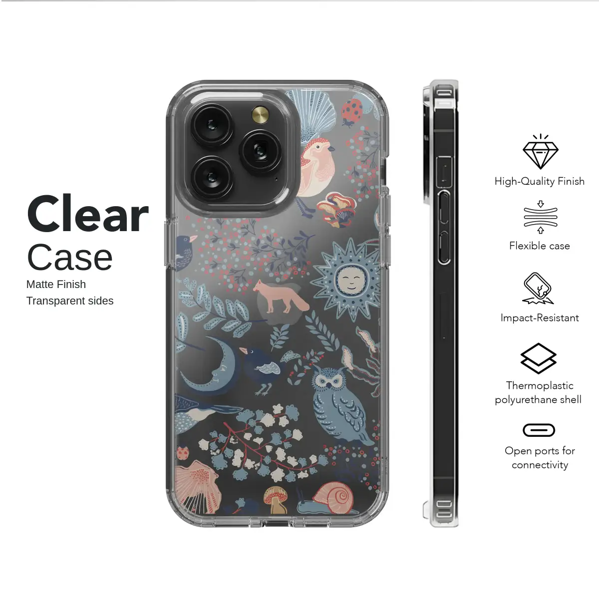 Clear Clear Whimsical Woodland Animals Celestial Folk Art Pattern Phone Case Cover for iPhone 17 Pro Max 16 15 13 Samsung S26 S25 Pixel 9962