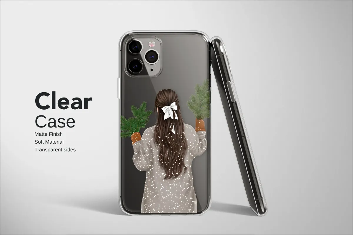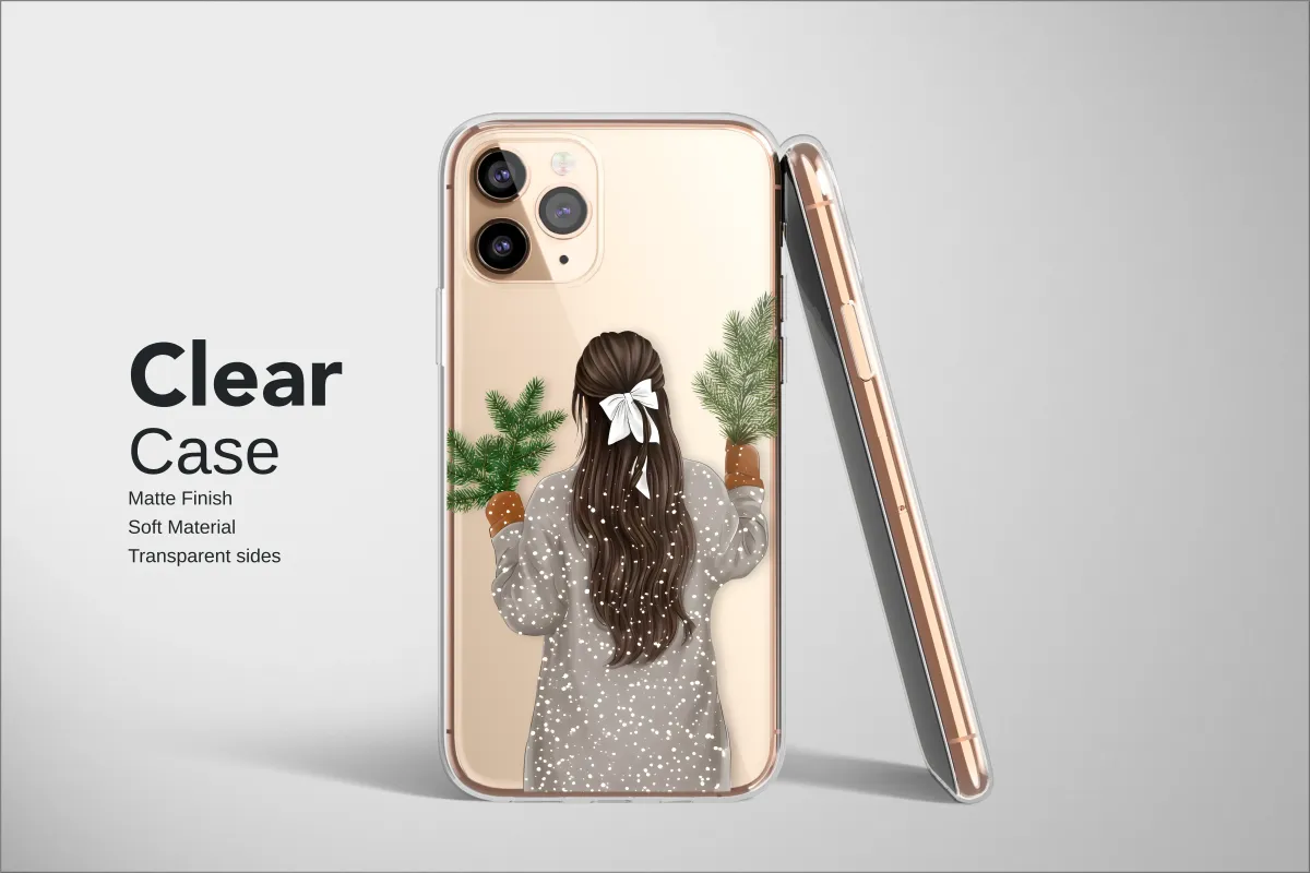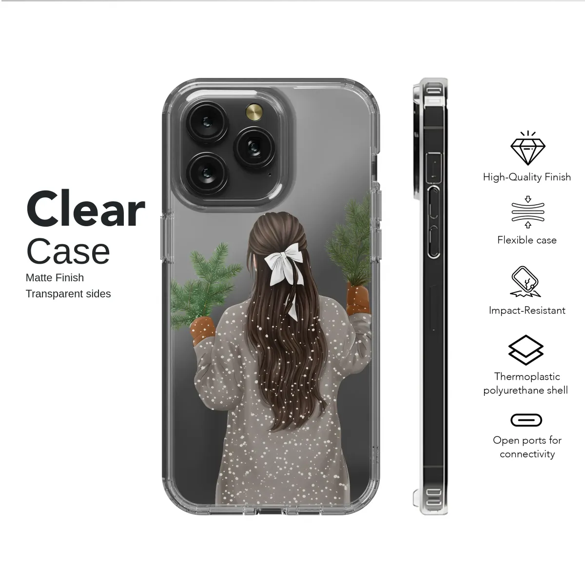 Clear Clear Winter Girl Illustration with White Bow and Pine Phone Case Cover for iPhone 17 Pro Max 16 15 13 Samsung S25 S24 Pixel 8556