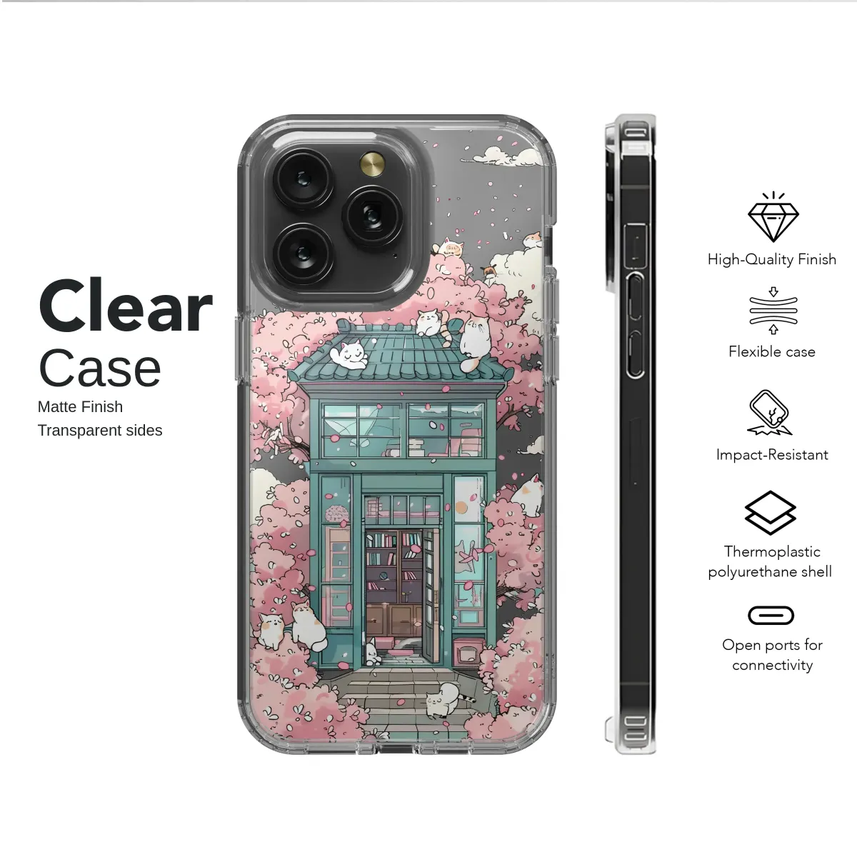 Clear Dreamy Sakura Cat Bookstore Art Phone Case iPhone Samsung Cover Pixel 7901