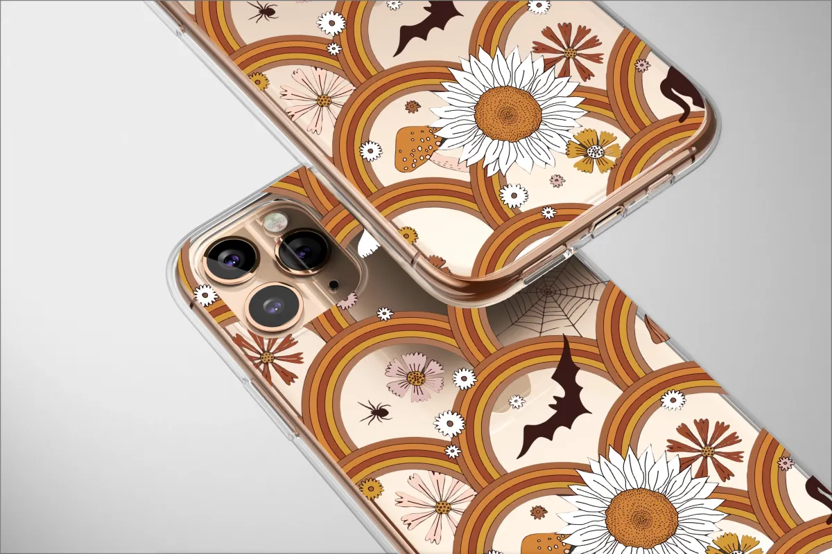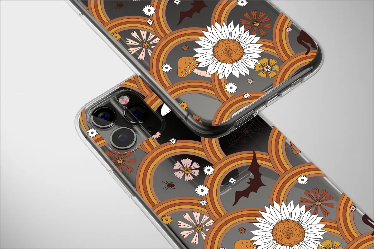 Immerse yourself in a whimsical midnight garden where spooky season perpetually dances with groovy 70s vibes. This enchanting artwork captures a unique, mystical mood, perfect for expressing your inner free spirit. Across a deep black canvas, lush, earthy rainbows arc in a mesmerizing pattern, painted in a warm palette of terracotta, burnt orange, mustard yellow, and deep brown. This retro backdrop sets the stage for a delightful collision of worlds. Hand-drawn daisies, cosmos, and bold sunflowers bloom with a nostalgic charm, scattered amongst curious toadstools and whimsical mushrooms straight from a fairytale forest. But look closer, and you'll find the subtle magic of the night. A silhouetted crow observes from its perch, a lone bat takes flight against the dark, and intricate spiderwebs are spun between the colorful curves. This design is a celebration of beautiful contradictions—the light and the dark, the floral and the mystical, the retro and the contemporary. It's an ideal piece for the modern witch, the bohemian dreamer, or anyone who finds beauty in the unconventional. Adorn your daily essentials with this captivating story, a piece of art that not only protects but also showcases your unique style and love for all things magical and wonderfully weird. It’s a wearable piece of enchantment, a conversation starter that connects you to a world of groovy ghouls and psychedelic dreams.