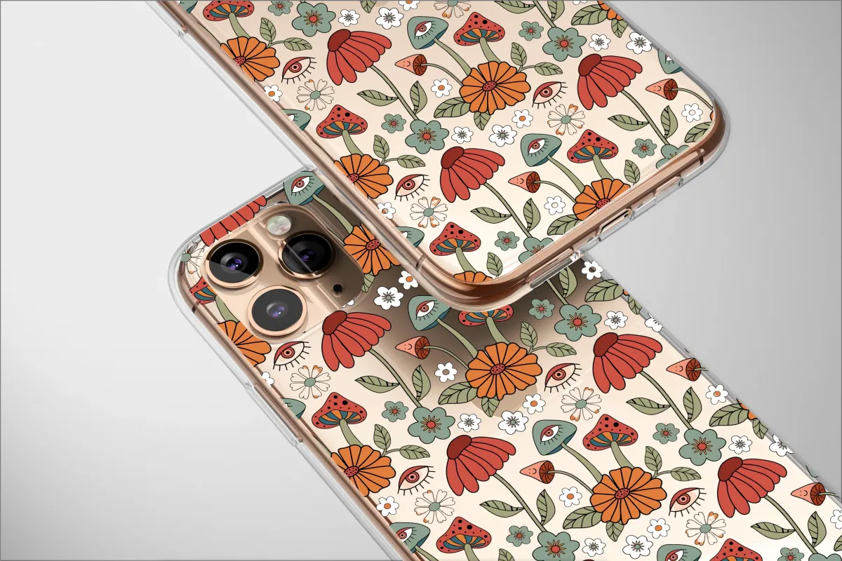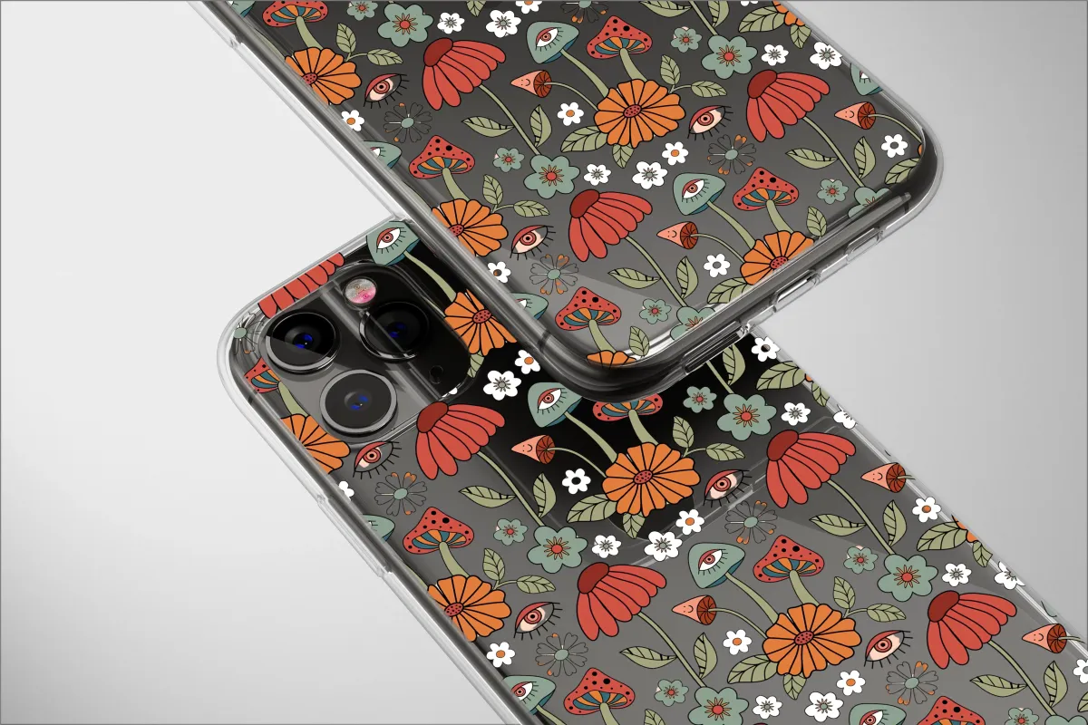 Step into a world where magic blossoms after dark with this captivating psychedelic design. This enchanting artwork transports you to a whimsical midnight garden, where curious mushrooms and vibrant retro flowers thrive under a secret moon. Each element tells a story—from the groovy, all-seeing eye mushrooms in muted sage to the cheerful red toadstools and bold orange coneflowers, all blooming against a dramatic black canvas. Feel the nostalgic pulse of 70s psychedelia mixed with a touch of modern witchy charm. The intricate botanical pattern, featuring delicate daisies, mystical butterflies, and watchful eyes, invites you to look closer and discover its hidden secrets. The earthy color palette of terracotta, olive green, and warm oranges creates a cozy yet mysterious atmosphere, making it a perfect gift for anyone who embraces a bohemian, hippie, or goblincore aesthetic. Let this captivating artwork be your daily talisman, a pocket-sized portal to a world of flower power and mystical wonder. It's more than just a pattern; it's a piece of wearable art that celebrates the quirky, the magical, and the beautifully strange. Protect your most-used belonging with this unique design and carry a piece of the enchanted forest with you wherever you go, adding a touch of personality and wonder to your everyday routine.