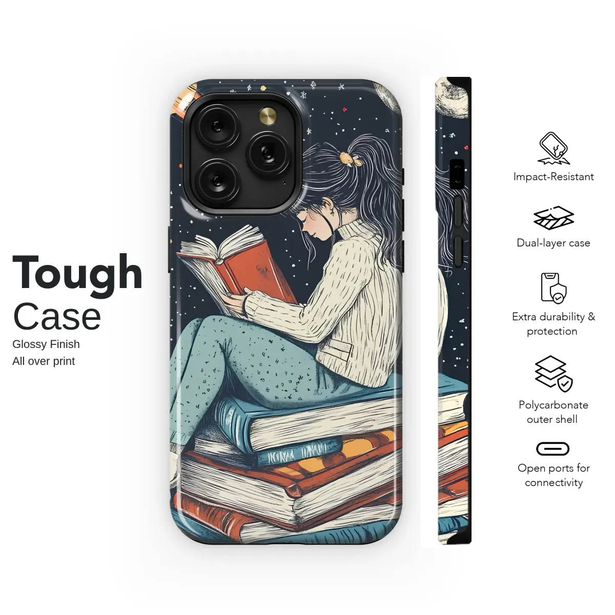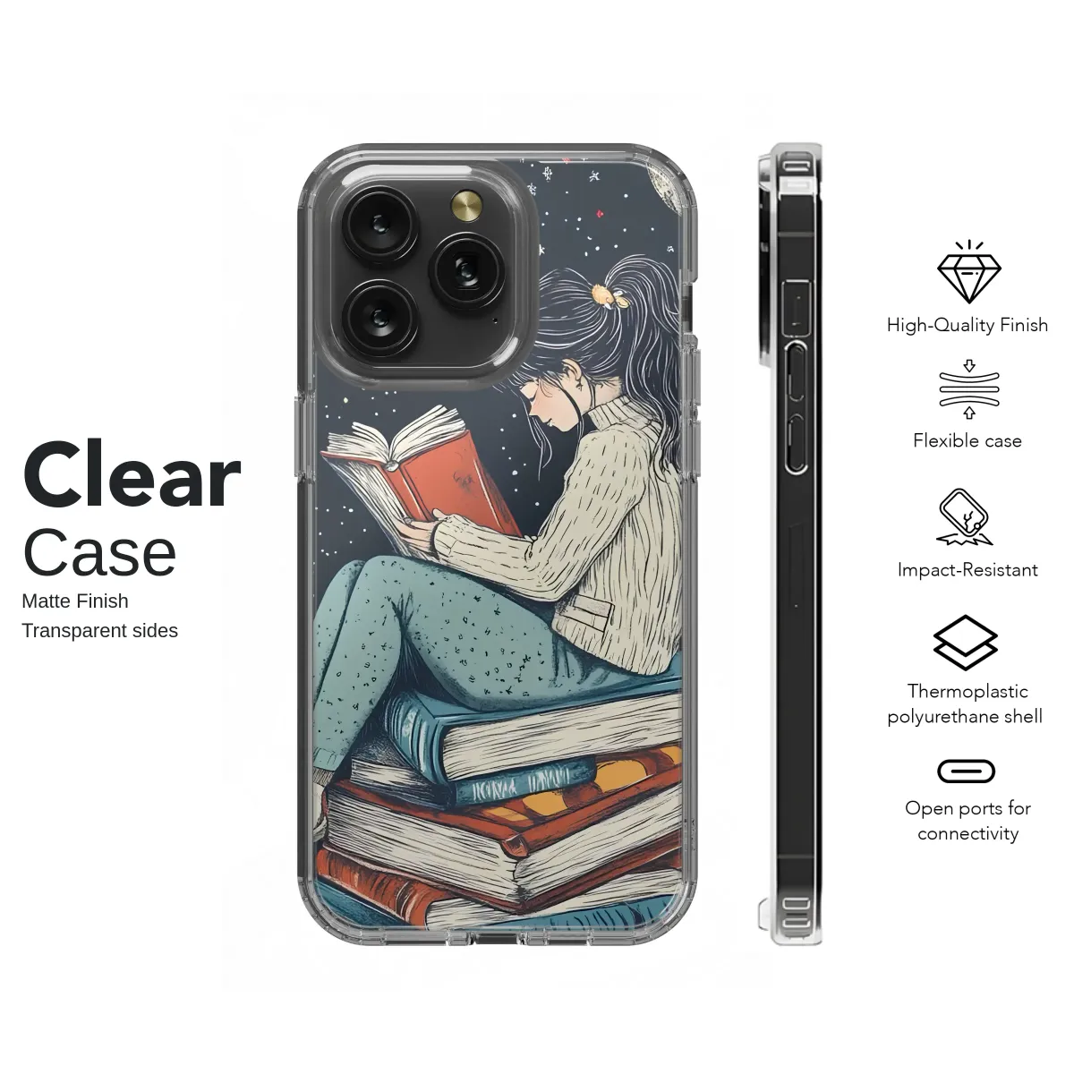 Escape into a galaxy of stories with this enchanting celestial design. It features a cozy girl lost in a book while sitting atop a towering stack of novels, all set against a backdrop of a twinkling starry night sky filled with whimsical planets and constellations. This beautiful illustration captures the magic of reading and the vastness of the universe, making it a perfect tribute for any bookworm or dreamer.