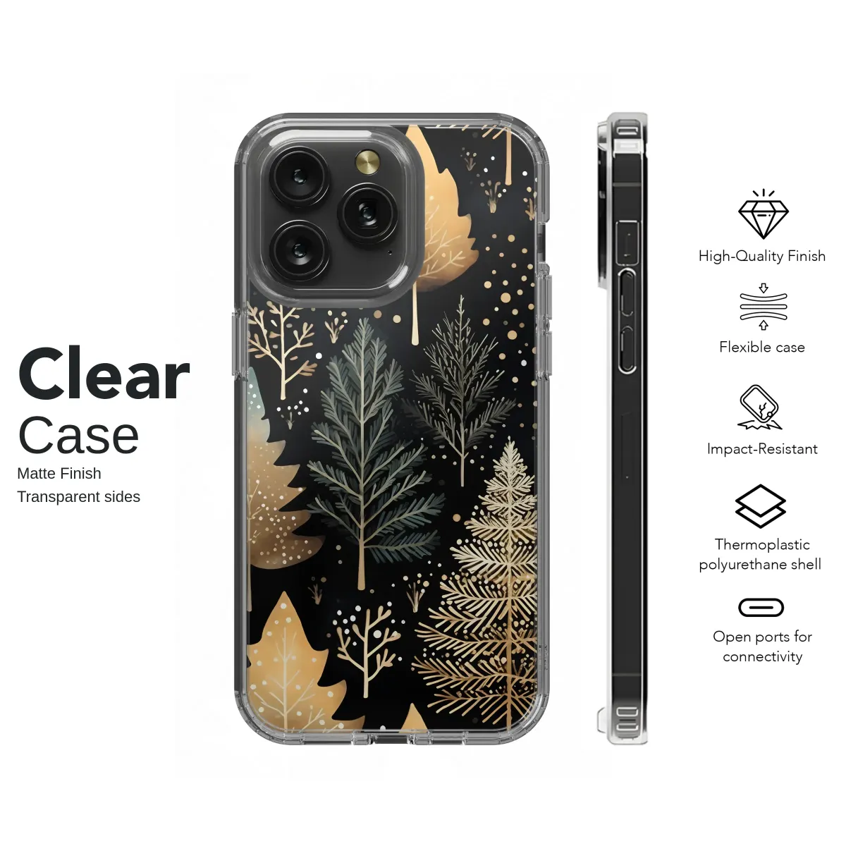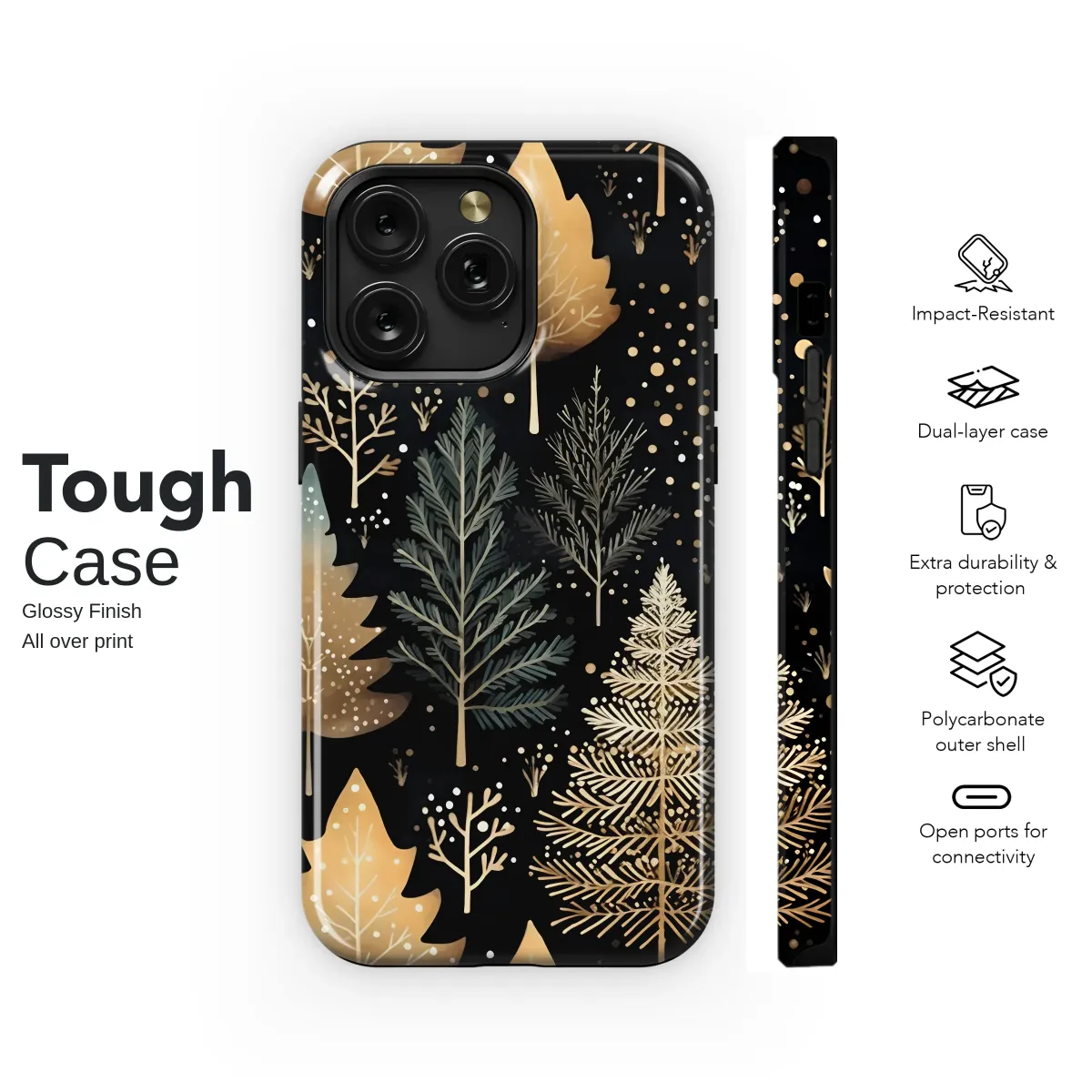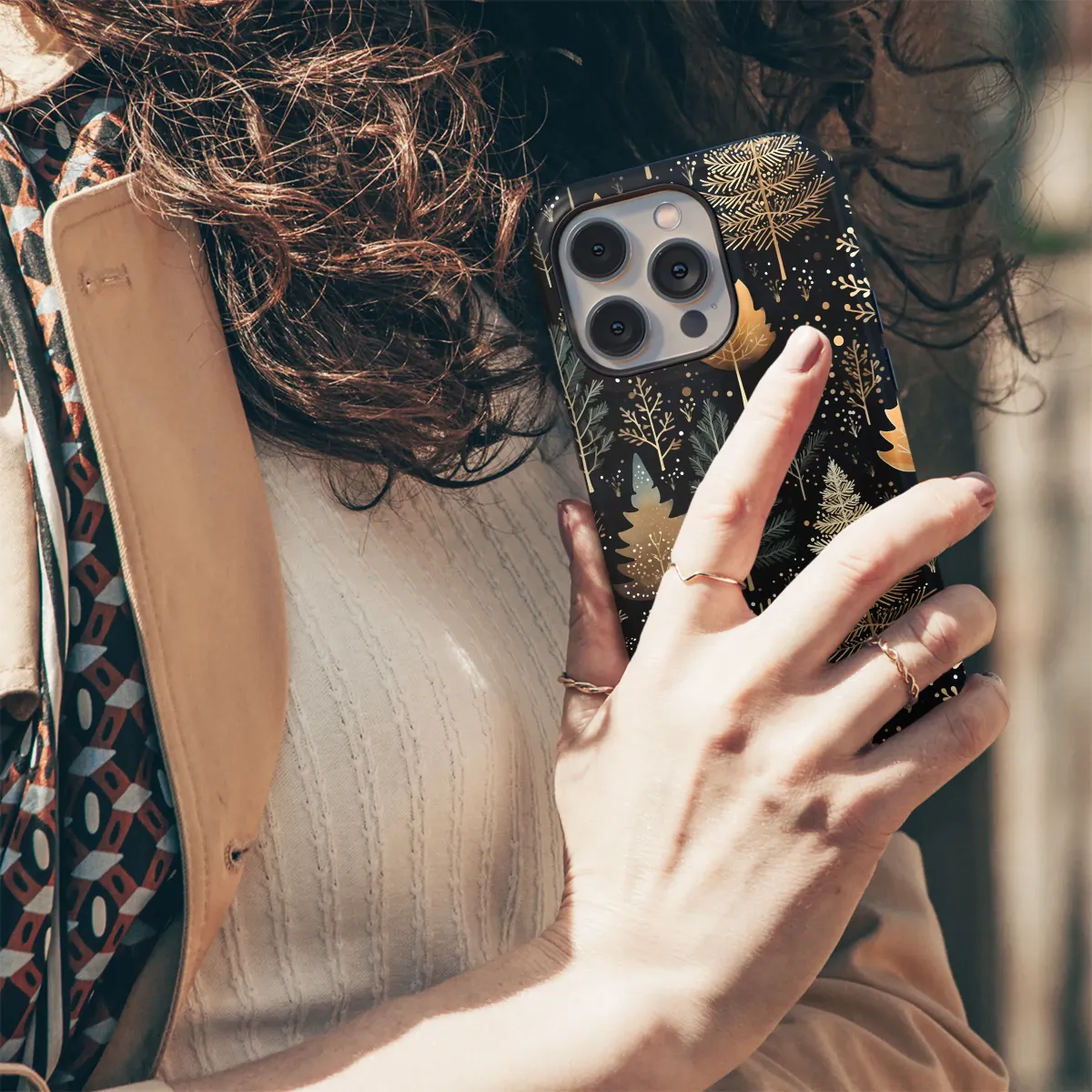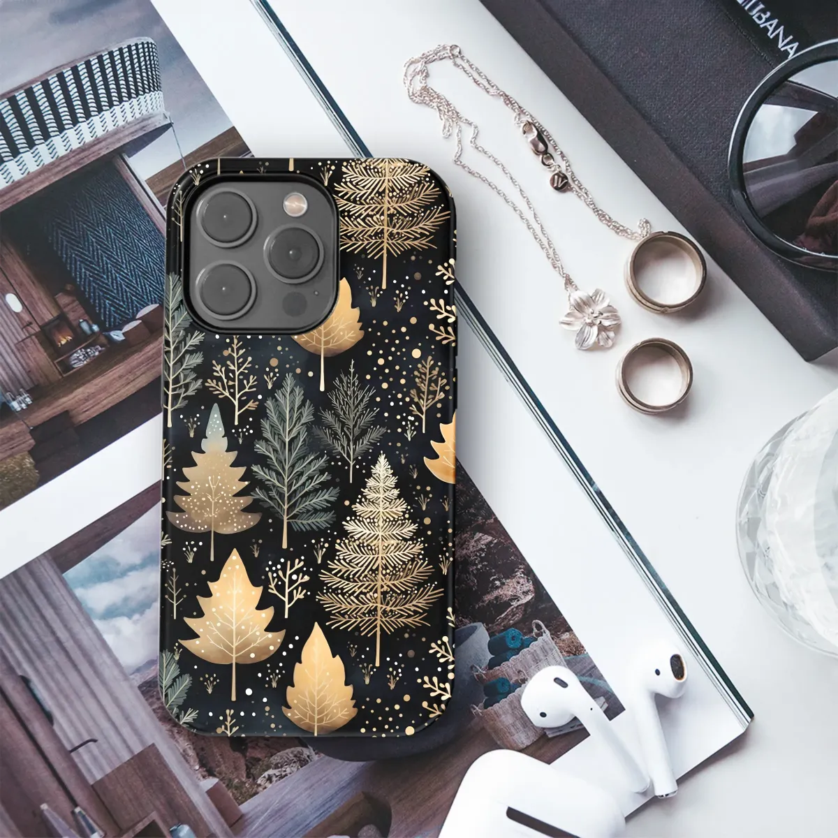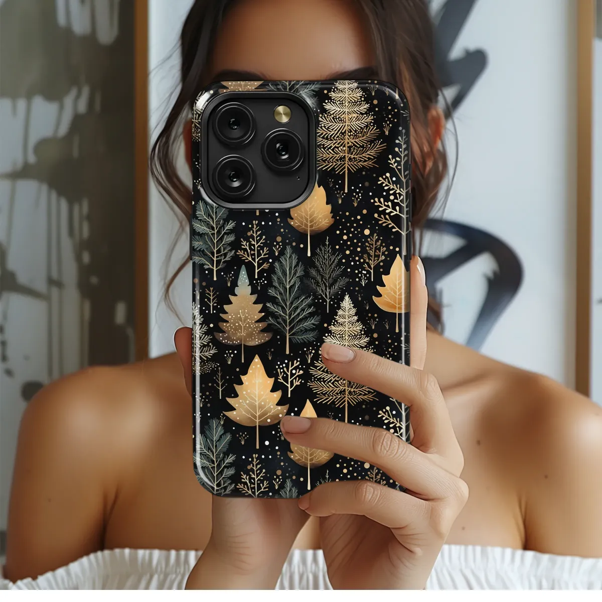 Step into a world of quiet magic with our Enchanted Winter Woods design, a captivating artwork that transports you to a silent, starlit forest where the air is crisp and filled with wonder. This intricate pattern features a dense grove of stylized trees against a deep, dramatic midnight black canvas, creating a stunning visual contrast. Each tree is a unique masterpiece; some shimmer with elegant, gilded details that catch the light like captured moonlight, their branches intricately drawn, while others stand in serene, earthy shades of muted sage and deep teal. Delicate, bare saplings and whimsical pines create a rich, layered tapestry, interspersed with tiny, scattered dots of gold and white that evoke a gentle snowfall or a sky full of distant stars. This design is more than just a pattern; it’s an escape into a tranquil, celestial landscape. It’s for the dreamer, the nature lover, and anyone who finds profound beauty in the quiet moments of the night. Adorn your most essential accessory with this piece of botanical art and carry a slice of the enchanted woodland with you. It’s the perfect, sophisticated touch for your daily style, a subtle nod to elegant forestcore and a beautiful gift for a kindred spirit who appreciates the serene magic of a gilded winter night.
