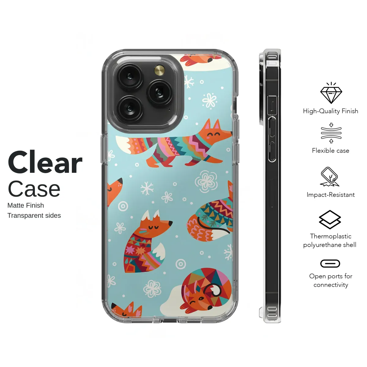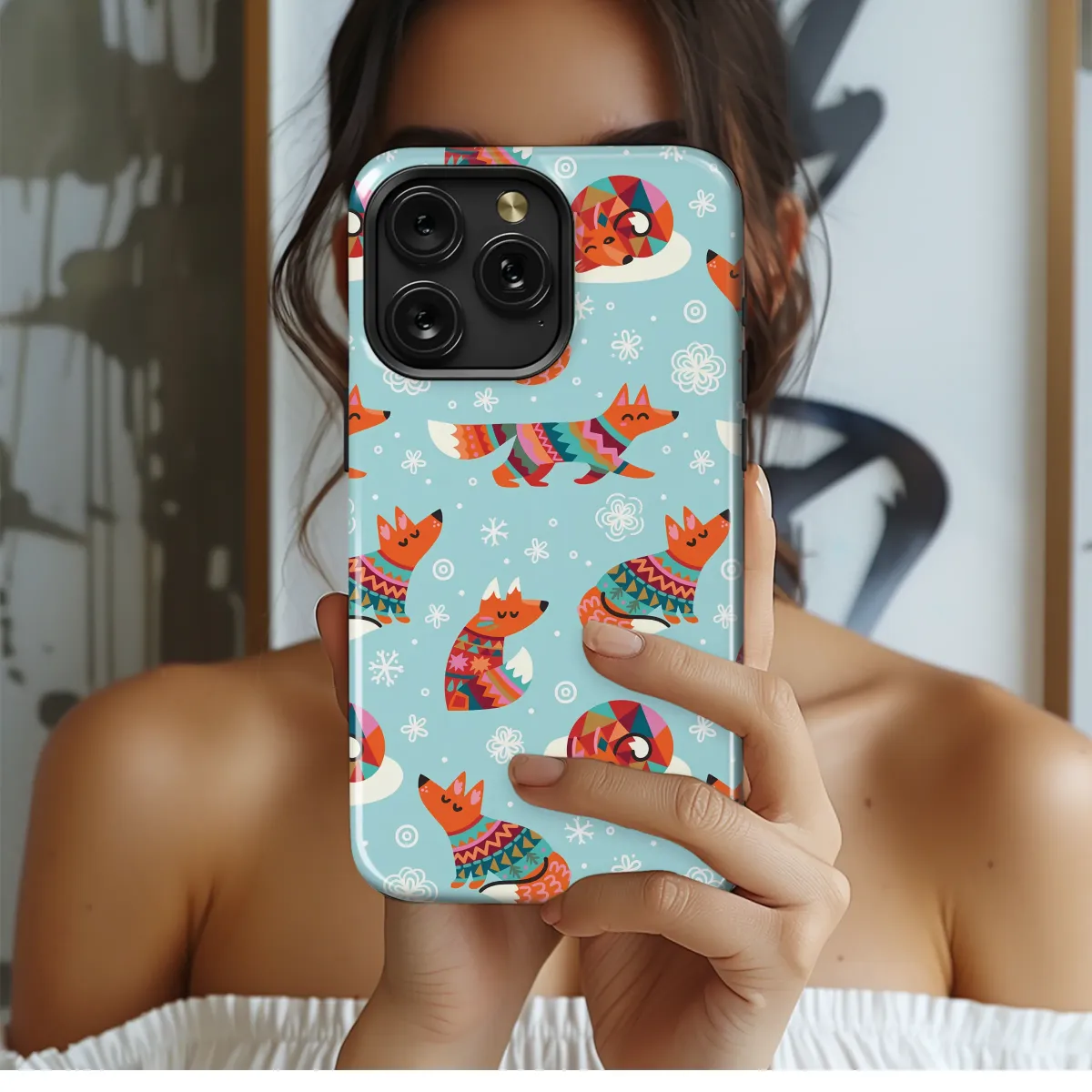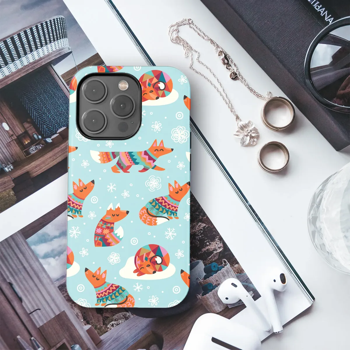 Wrap your phone in the charm of a winter woodland with this delightful folk art fox phone case. The vibrant, Scandinavian-inspired pattern features cute foxes in colorful sweaters, frolicking in a gentle snowfall, making it a unique accessory for any animal lover. This protective case showcases a playful and intricate design, bringing a touch of whimsical nature art to your daily routine. It’s not just a cover; it’s a piece of art that protects your device from daily bumps and scratches. Key Features: • Durable polycarbonate shell with a soft rubber lining • High-quality UV printing for a vibrant, long-lasting finish • Snug fit with precisely aligned port openings • Compatible with wireless charging Available for a wide range of iPhone models. Please select your device from the dropdown menu. To clean, simply wipe with a damp cloth.