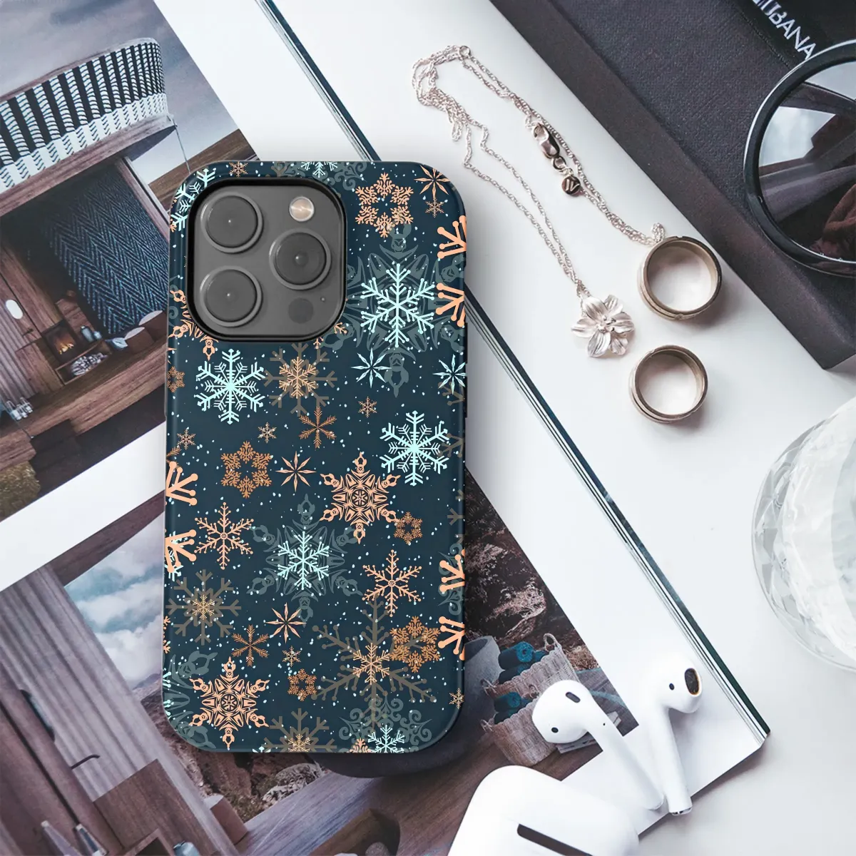 Frosted Teal and Copper Snowflakes Phone Case iPhone Samsung Cover Pixel 7994 - Image 1