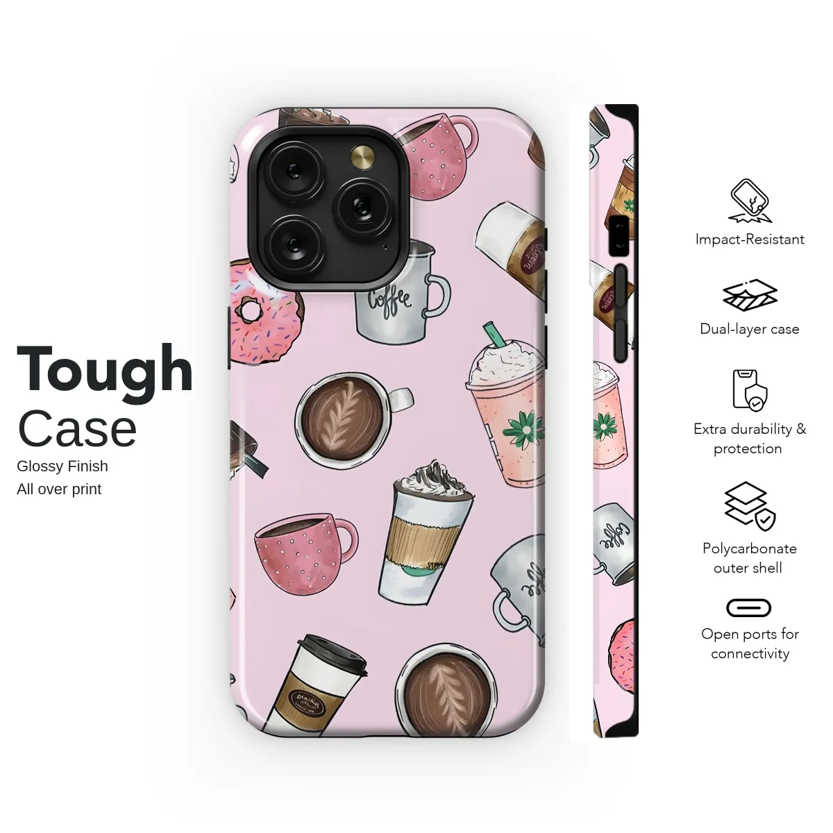 Illustrated Coffee and Donuts Pink Pattern Phone Case Cover for iPhone 17 Pro Max 16 15 Plus 14 13 Mini Samsung S25 S24 Pixel 10 9 9211