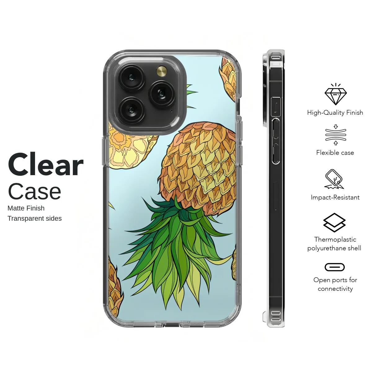 Add a splash of tropical fun to your everyday with this vibrant pineapple pattern phone case. Featuring a cheerful, hand-drawn design of whole and sliced pineapples on a light blue background, this cover brings a sunny, vacation-ready feel to your device. Inspired by warm beach days and sweet summer fruits, this design is perfect for anyone who loves bright colors and playful patterns. It’s a small piece of paradise you can carry with you everywhere. Key Features: • Durable Protection: Made from a hybrid Thermoplastic Polyurethane (TPU) and Polycarbonate (PC) material to guard against scratches, dust, and minor drops. • Vivid, Lasting Print: The design is UV printed for a vibrant, long-lasting finish that resists fading and chipping. • Slim & Lightweight: Offers solid protection without adding bulk, maintaining your phone's sleek profile. • Precise Cutouts: Ensures easy access to all ports, buttons, and camera functions. Available for a wide range of iPhone, Samsung Galaxy, and Google Pixel models. Select your device from the dropdown menu.
