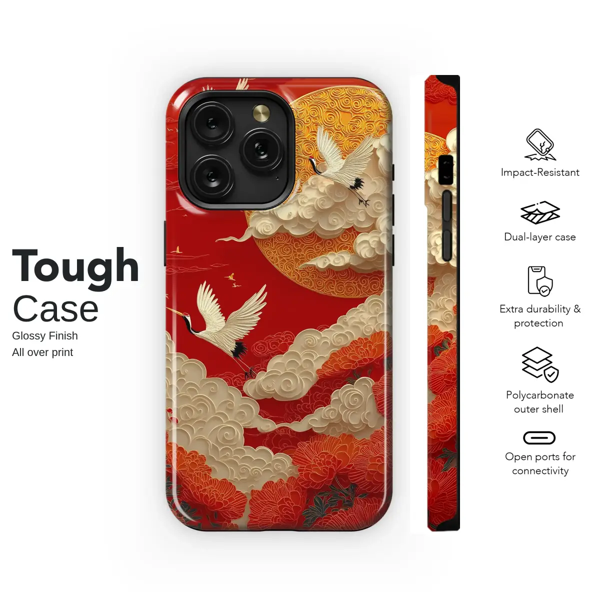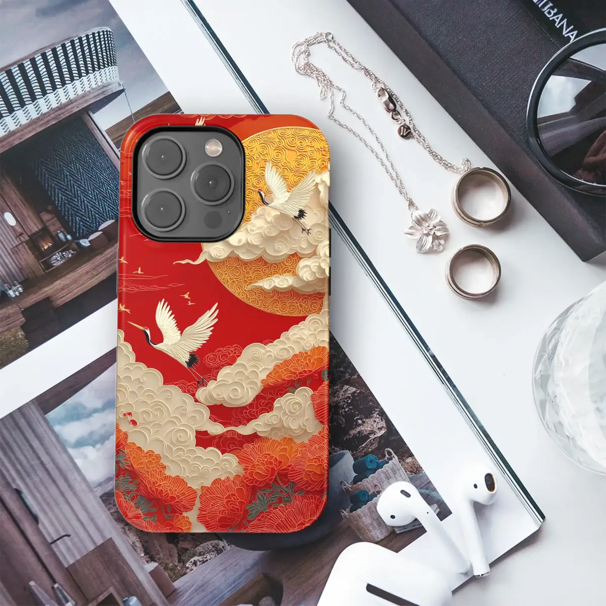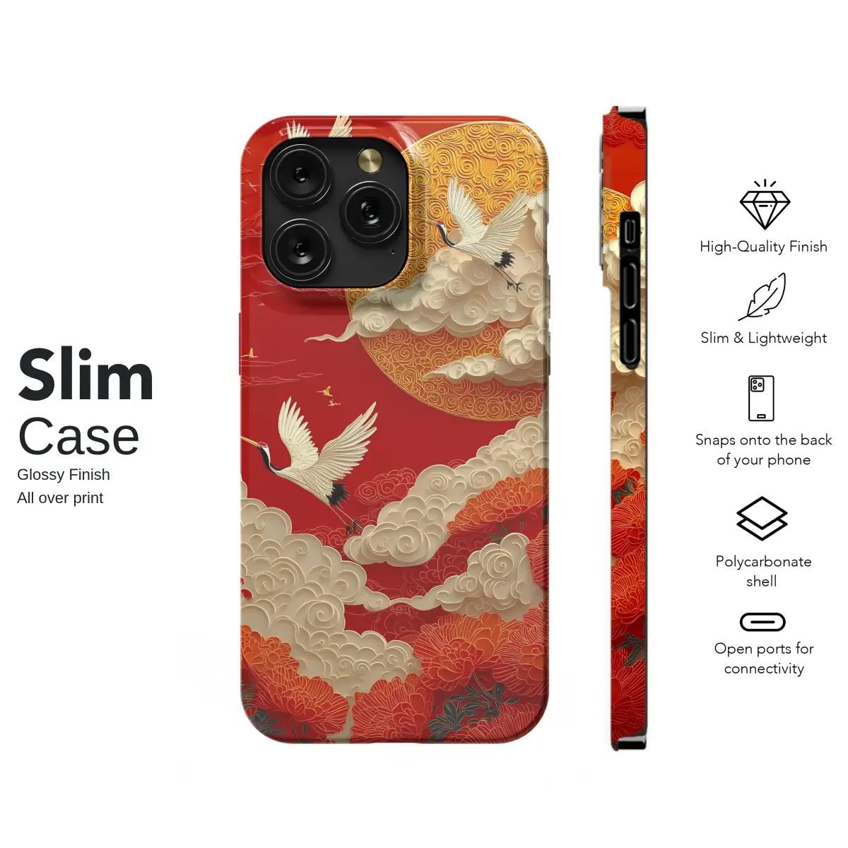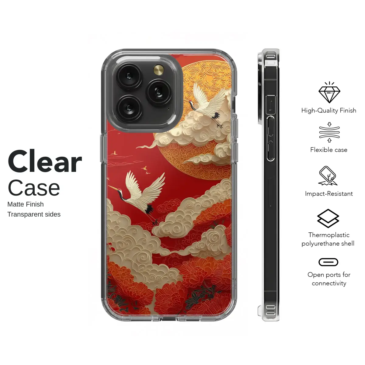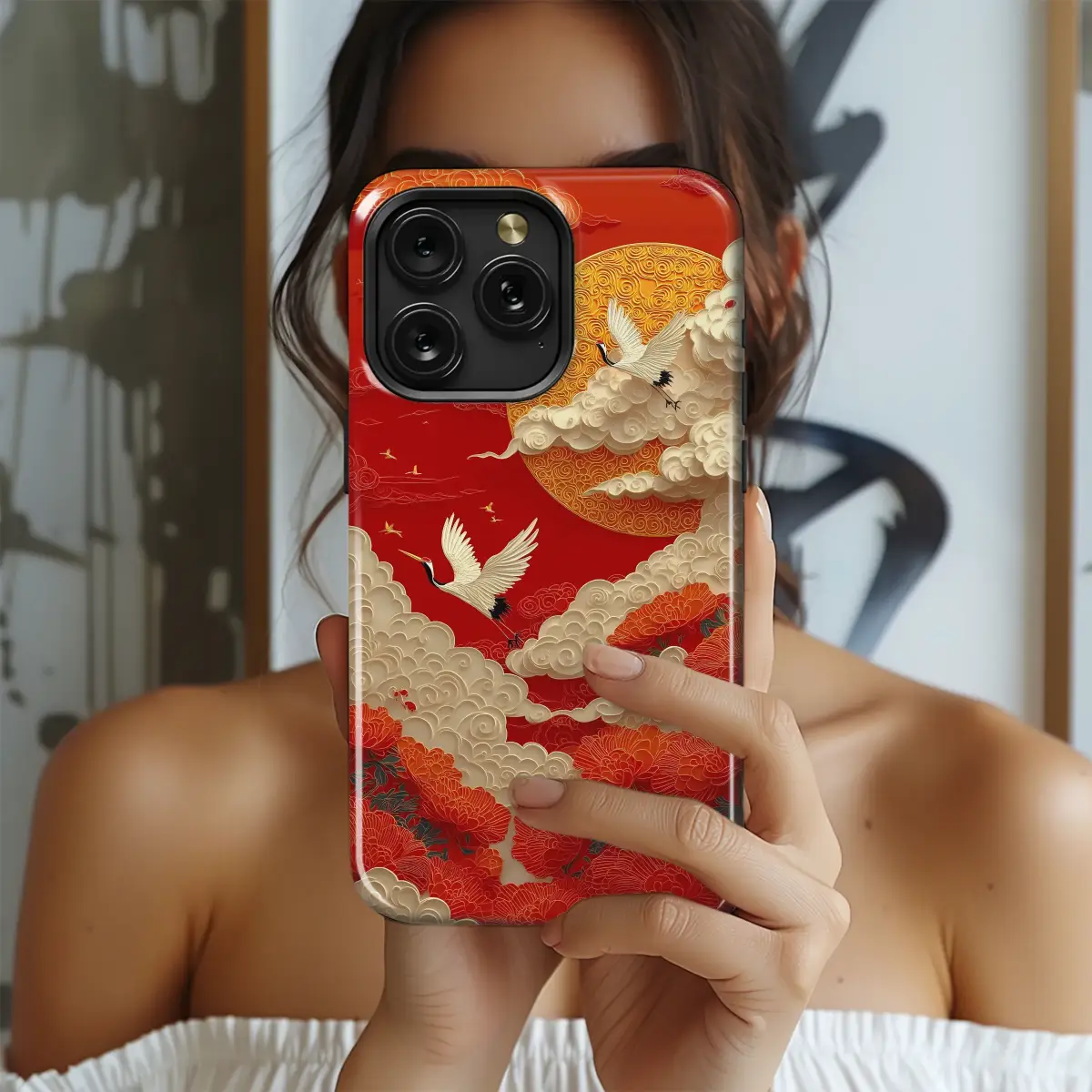 Japanese Cranes and Red Sun Traditional Asian Art Phone Case Cover for iPhone 17 Pro Max 16 15 13 Samsung S26 S25 Pixel 9726