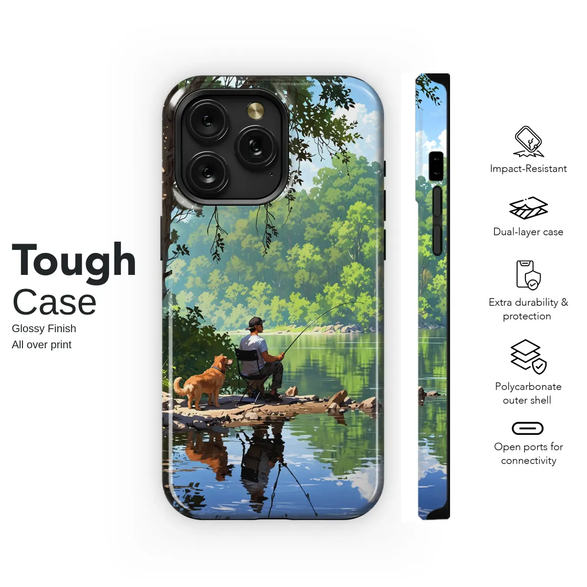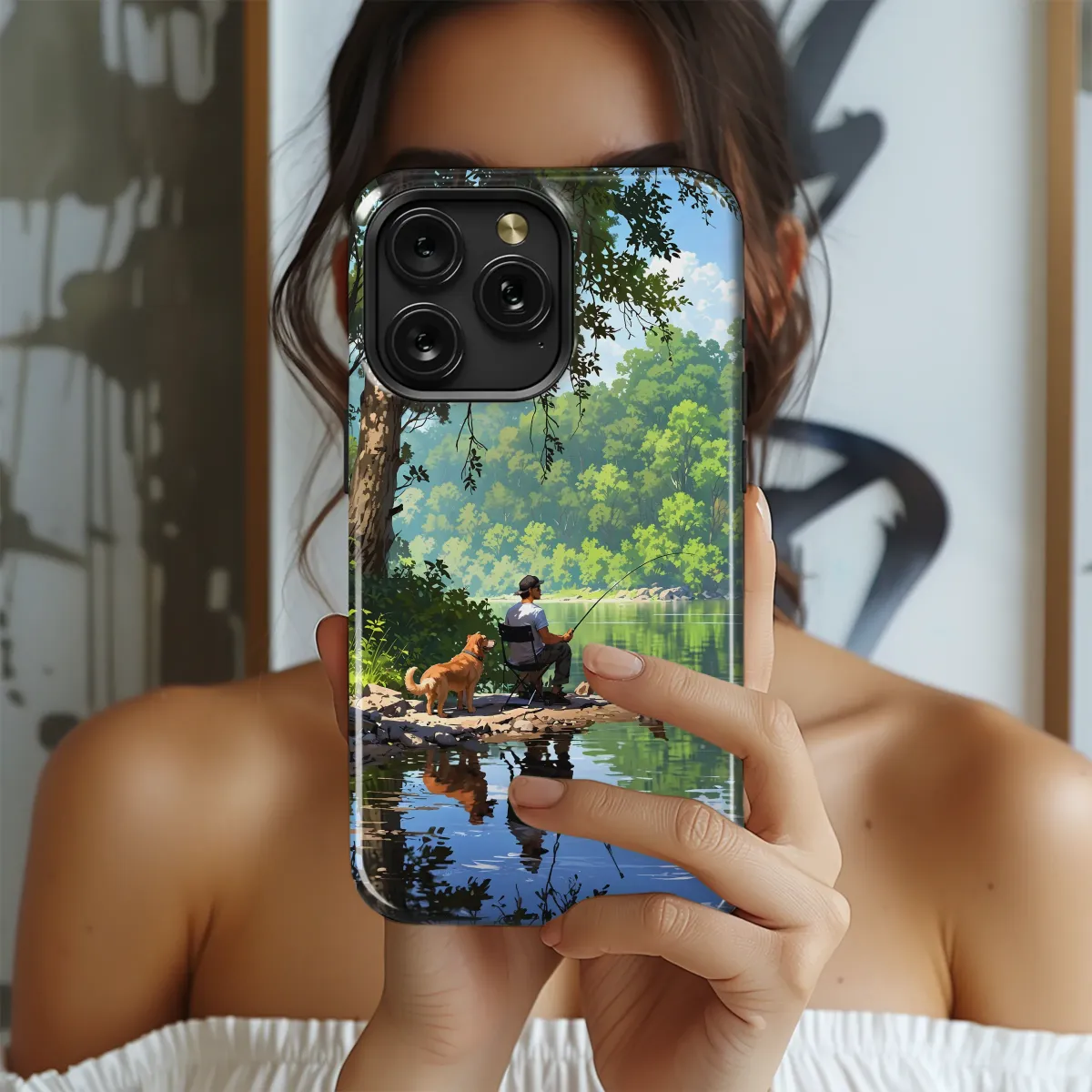 Man Fishing with Dog Lake Scenery Illustration Phone Case Cover for iPhone 17 Pro Max 16 15 Plus 14 13 Mini Samsung S25 S24 Pixel 10 9 9165