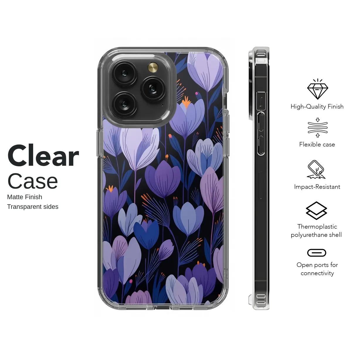 Embrace an elegant, moody aesthetic with this stunning dark floral design. The artwork features a captivating garden of stylized crocus and tulip-like flowers, rendered in a sophisticated palette of deep purple, lavender, and cool blue. Set against a dramatic black background, the intricate botanical illustration adds a touch of nature-inspired artistry to your daily essentials.
