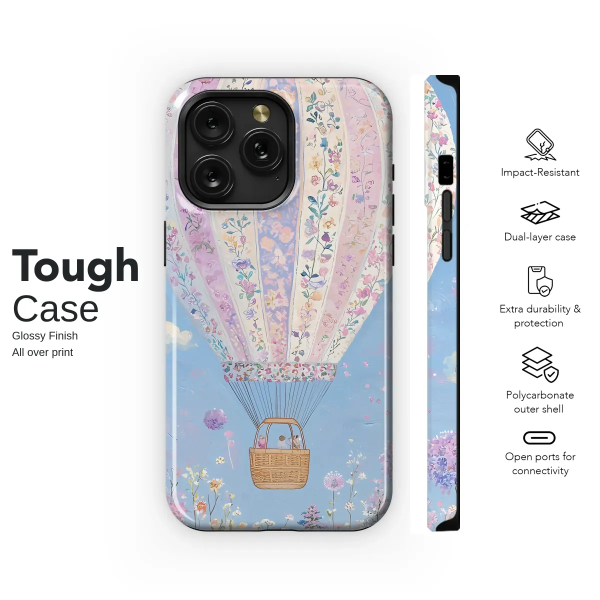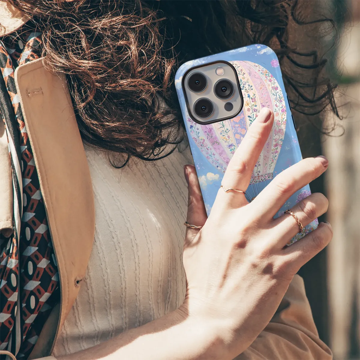 Protect your phone with a touch of whimsy featuring this painterly hot air balloon case. Adorned with delicate floral patterns in soft pastel hues, this design captures the serene beauty of a balloon drifting over a wildflower field, perfect for those who love cottagecore charm and dreamy aesthetics. Our cases provide both style and durable protection for your device, making it a unique accessory or a thoughtful gift. Key Features: * Vibrant, high-resolution UV printed design with a glossy finish. * Dual-layer case for extra durability and shock absorption. * Tough polycarbonate outer shell with a flexible TPU inner liner. * Clear, open ports for connectivity and supports wireless charging. * Available for most iPhone and Samsung Galaxy models. Inspired by idyllic spring days and gentle adventures, this phone case brings a piece of serene fantasy to your everyday life. Let the intricate botanical details and soft, cloudy backdrop inspire your day.