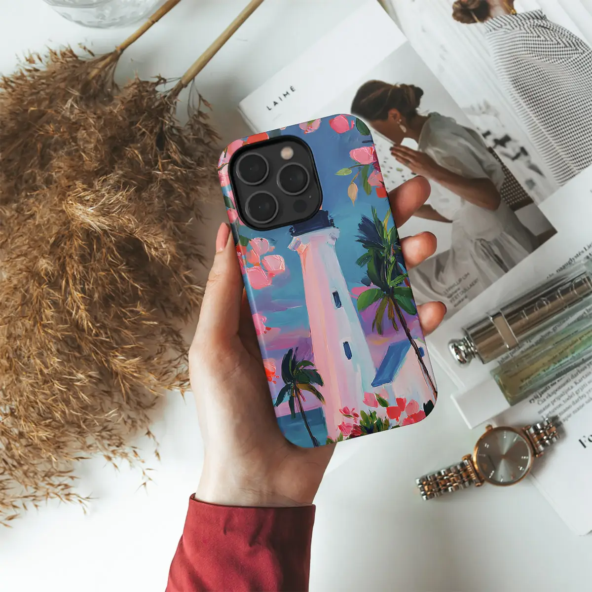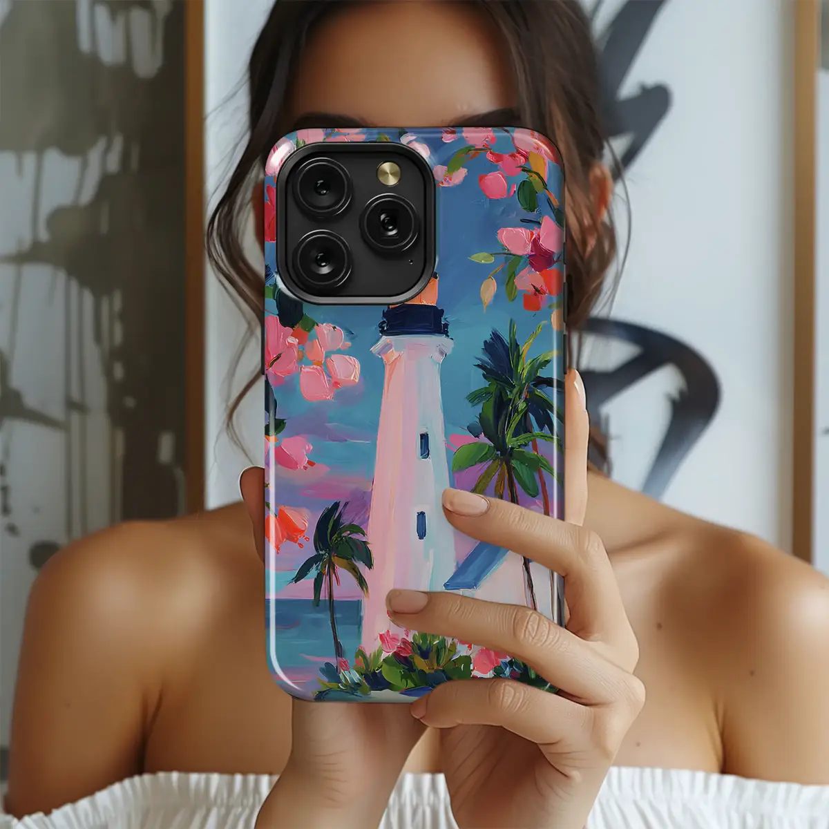 Painterly Lighthouse Art Tropical Seascape with Pink Flowers Phone Case Cover for iPhone 17 Pro Max 16 15 13 Samsung S26 S25 Pixel 9907