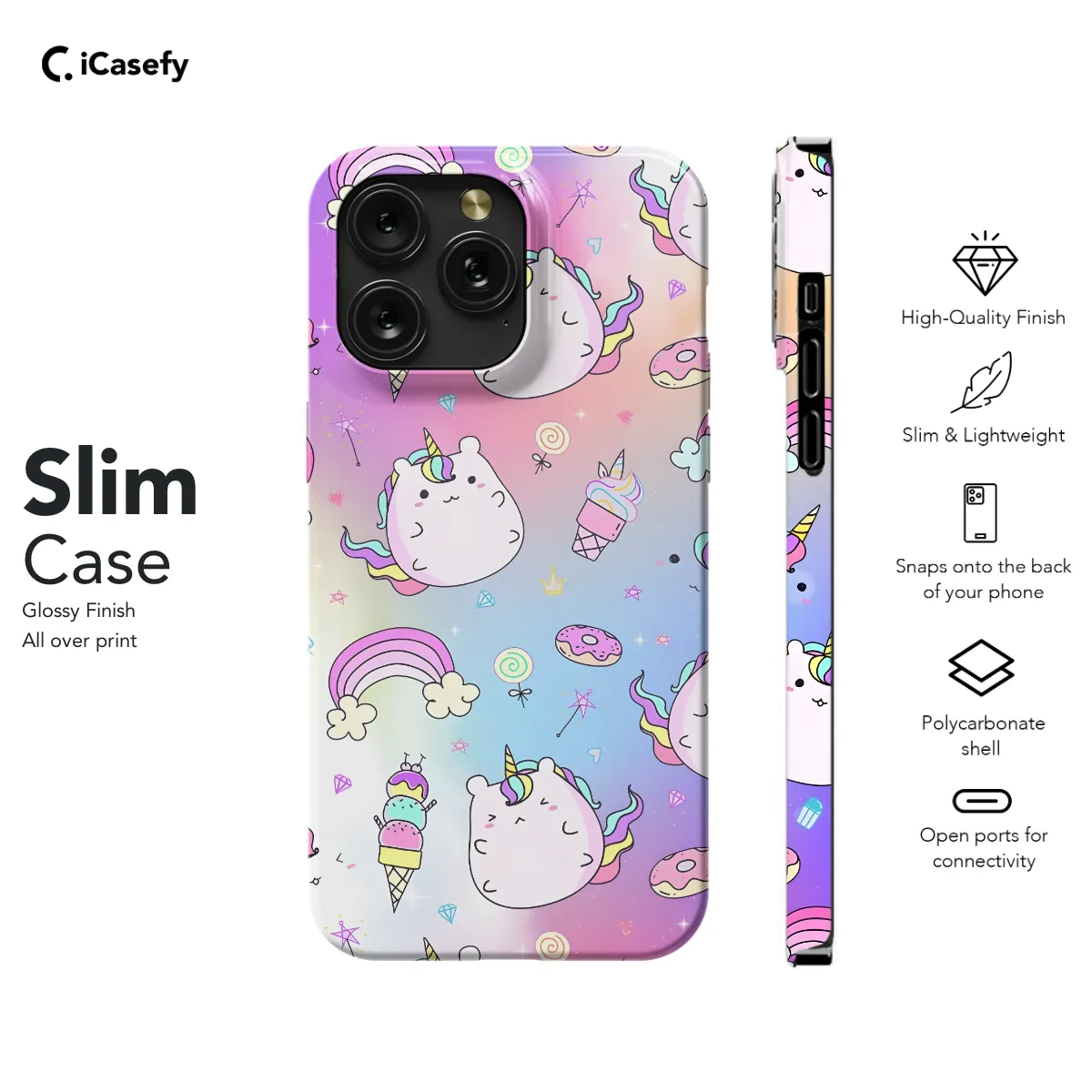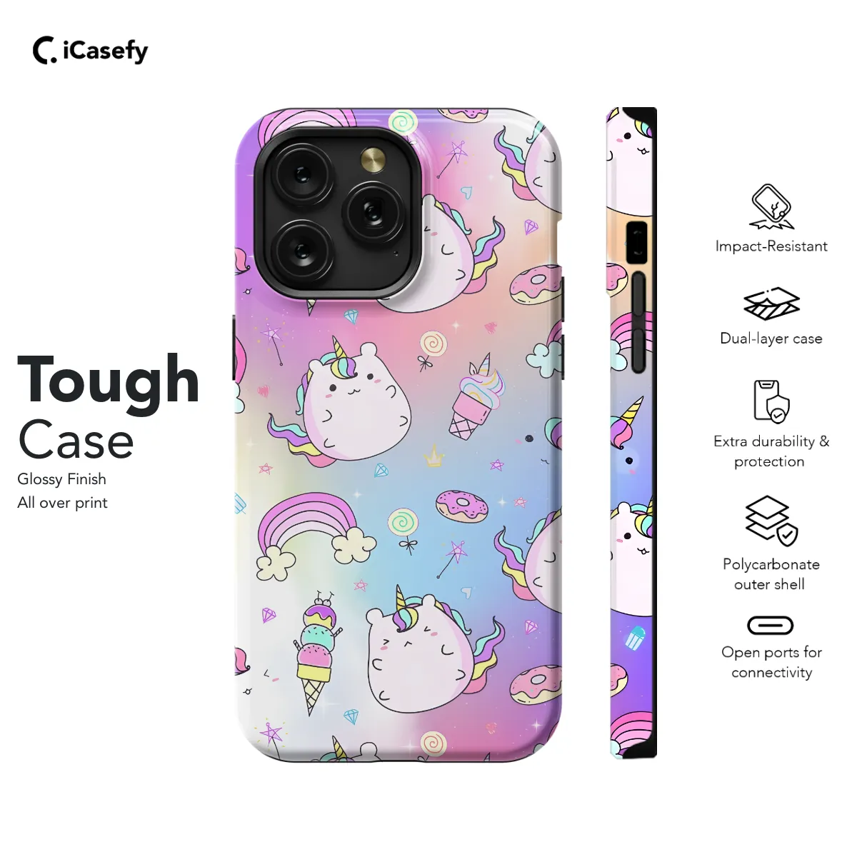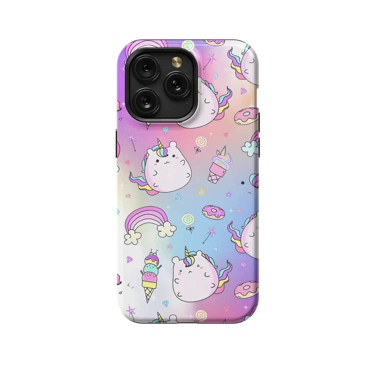 Fun and whimsical, this Rainbow Ice Cream Unicorn Phone Case is the perfect way to add a touch of magic to your phone. The case features an adorable unicorn standing on top of an equally colorful ice cream cone, all against a vibrant rainbow background. Whether you're a unicorn lover, an ice cream enthusiast, or simply someone who loves to add a bit of whimsy to their life, this phone case is sure to bring a smile to your face every time you look at it.