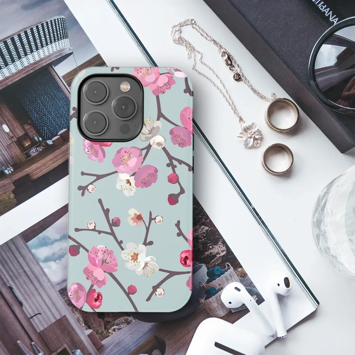 Immerse yourself in the quiet beauty of a tranquil Japanese garden with this captivating artistic design. It captures that magical, fleeting moment of the first blush of spring, where delicate sakura blossoms burst into life, dancing gracefully across a serene, dusty blue sky. Each petal is a miniature masterpiece, rendered in a stunning palette of vibrant fuchsia, soft blush pink, and creamy ivory, while tiny golden stamens add a joyful sparkle. These beautiful flowers seem to whisper tales of renewal, hope, and gentle new beginnings, a perfect reminder of nature's cycles. Intricate dark branches weave an elegant, organic tapestry, providing a beautiful contrast that makes the blossoms pop with life and color. This is more than just a pretty pattern; it's a portable piece of serenity, an artistic statement that infuses your most essential tech with calm, nature-inspired elegance. Let this stunning botanical illustration transform your everyday accessory into a canvas of wearable art, a little escape into nature whenever you need it. It’s an ideal way to express your love for floral aesthetics and the timeless charm of Japanese art. This design makes a thoughtful and unique gift for birthdays, anniversaries, or 'just because' for anyone who appreciates the delicate strength of nature, bringing the peaceful atmosphere of a blossoming orchard right to the palm of their hand.