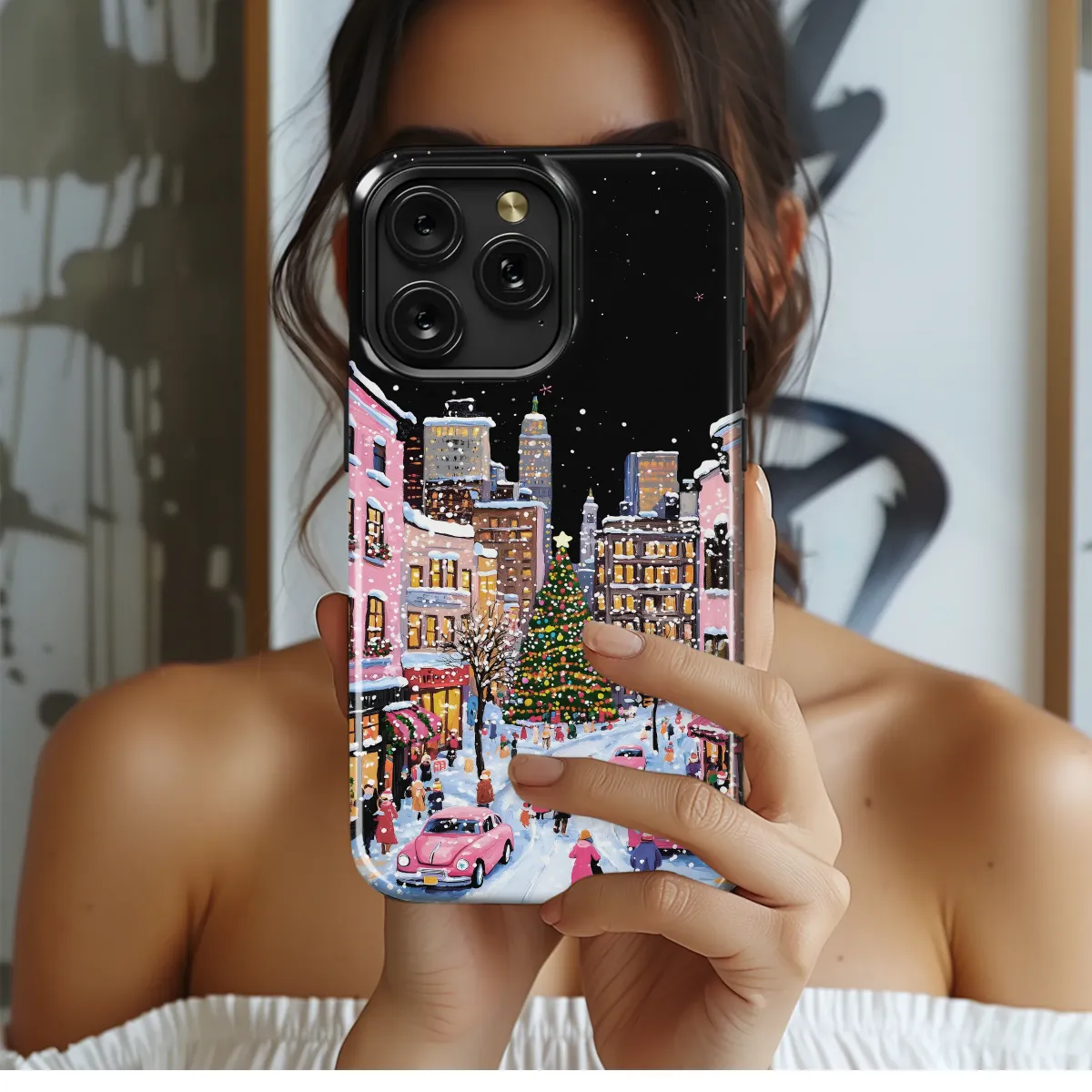 Snowy Christmas City Painting Festive Pink Winter Scene Phone Case Cover for iPhone 17 Pro Max 16 15 13 Samsung S25 S24 Pixel 8844