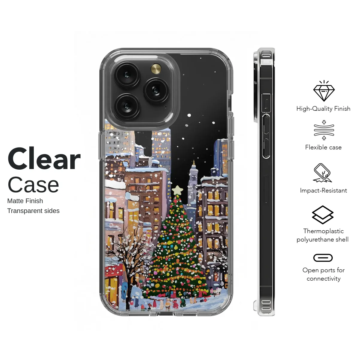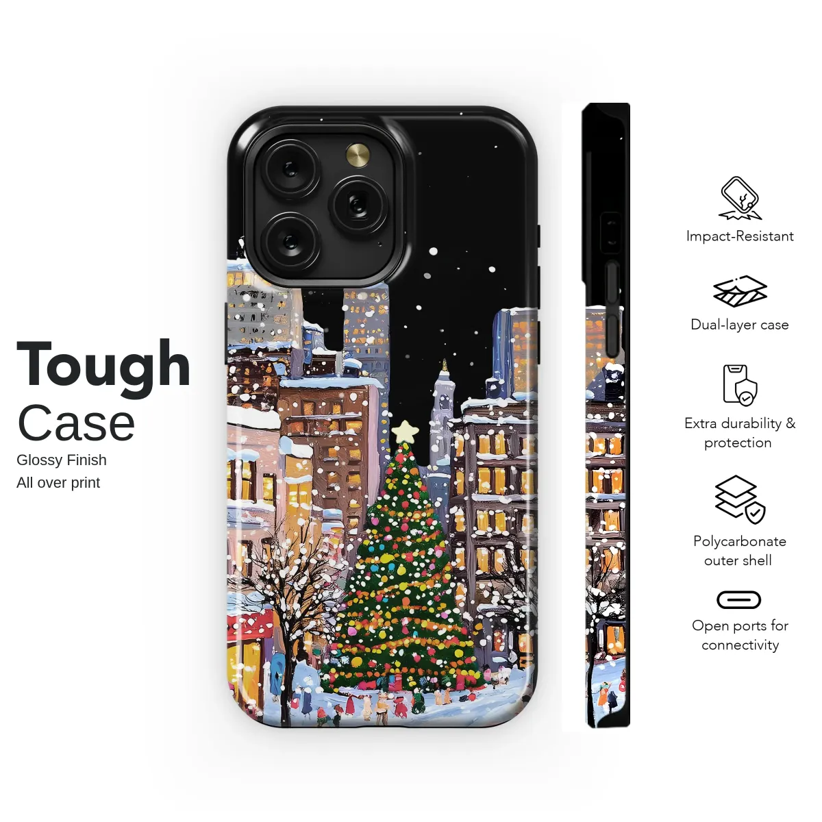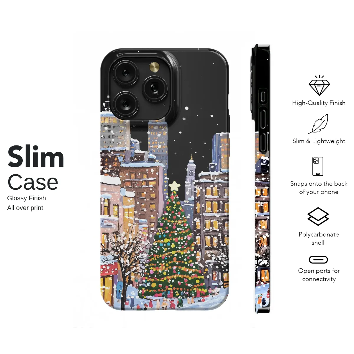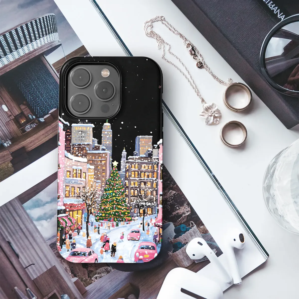 Embrace the magic of the holiday season with this charming snowy city scene. The design captures a festive street bustling with people, featuring a beautifully decorated Christmas tree, vintage pink cars, and buildings glowing with warm light against a snowy night sky. Its unique, painterly style brings a touch of artistic flair and winter wonderland magic to your everyday accessory.
