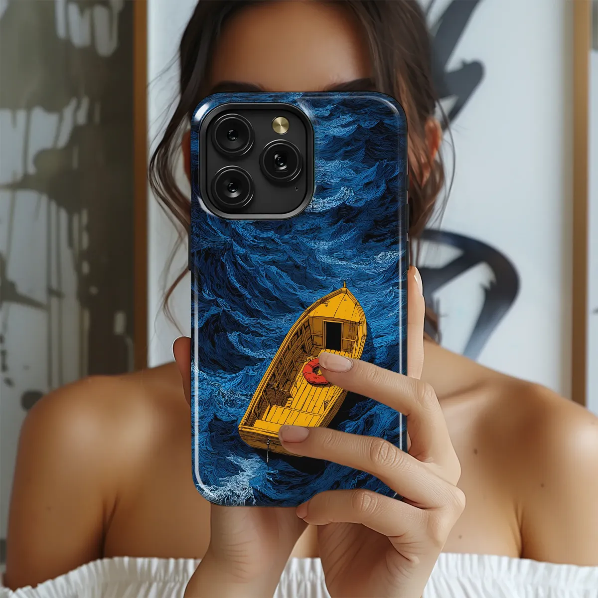 Solitary Yellow Boat on Stylized Blue Sea Illustration Phone Case Cover for iPhone 17 Pro Max 16 15 13 Samsung S26 S25 Pixel 9639 - Image 1