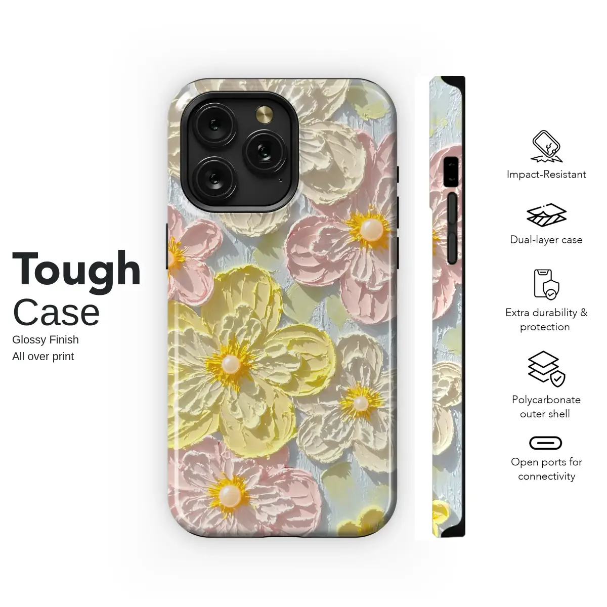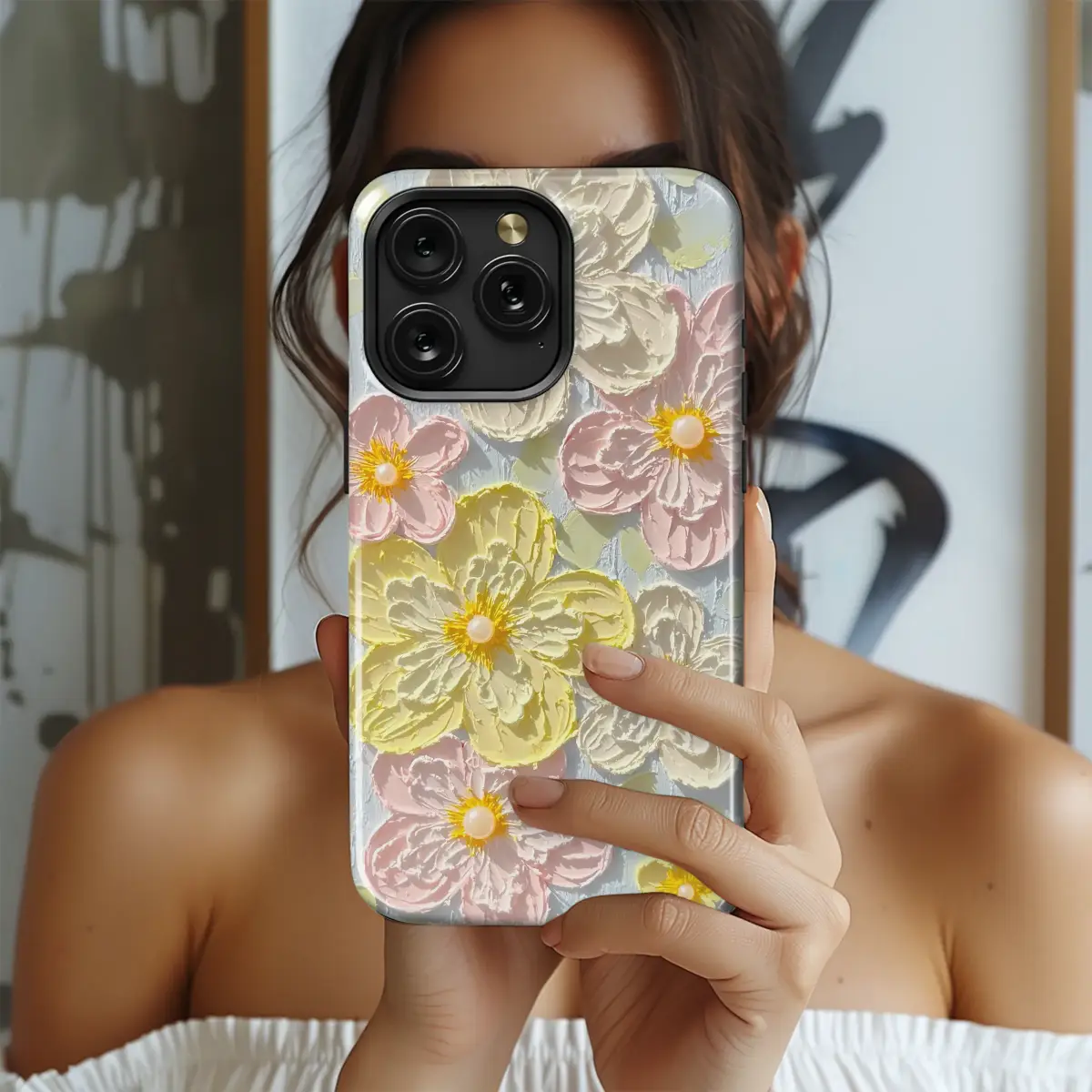Adorn your device with this stunningly textured floral artwork. Featuring a beautiful 3D impasto effect, this design showcases lovely blossoms in soft pastel yellow, pink, and cream hues. Each flower is meticulously crafted with thick, tactile petals and is accented with an elegant pearl at its center, all set against a lightly textured blue background, bringing a touch of delicate, artistic charm.