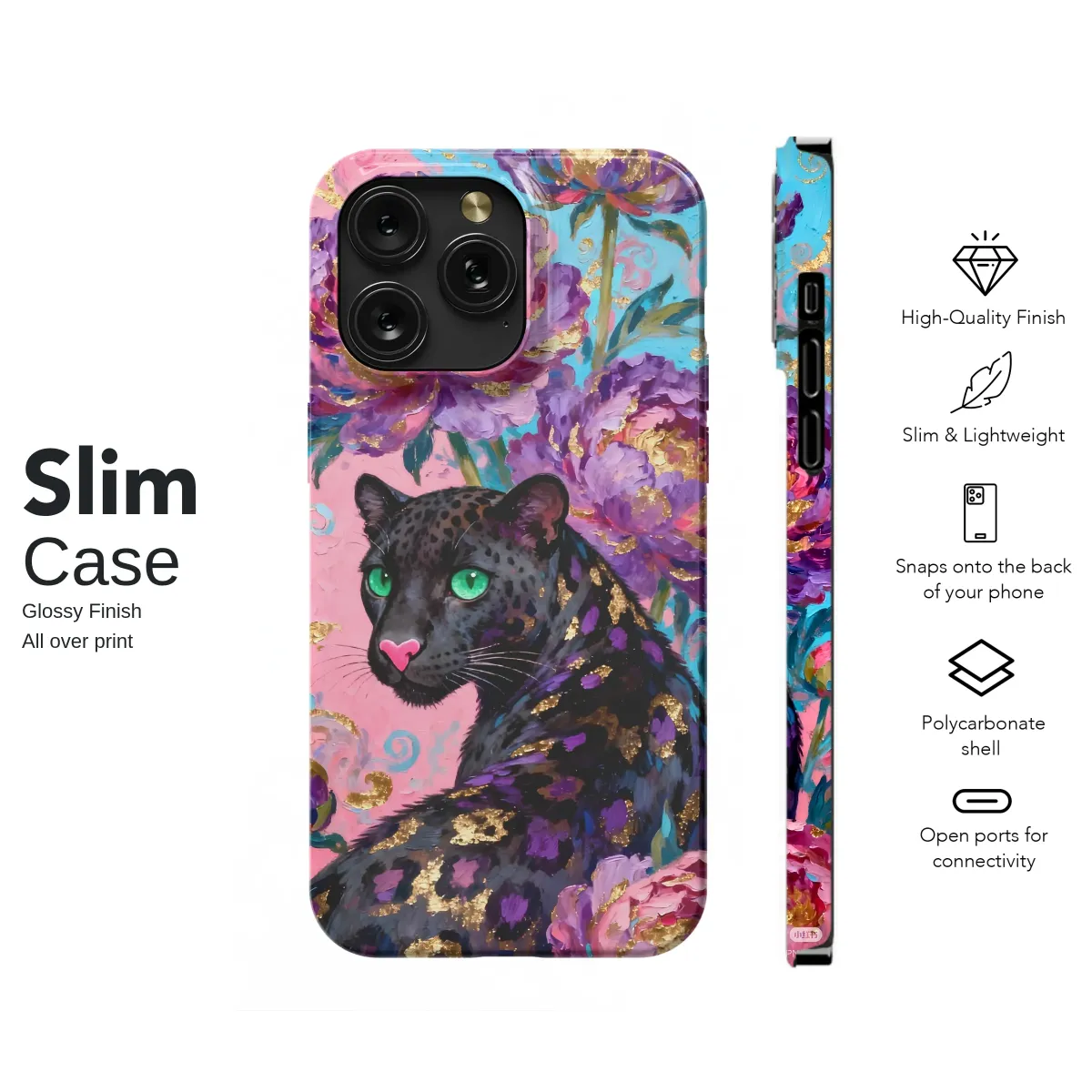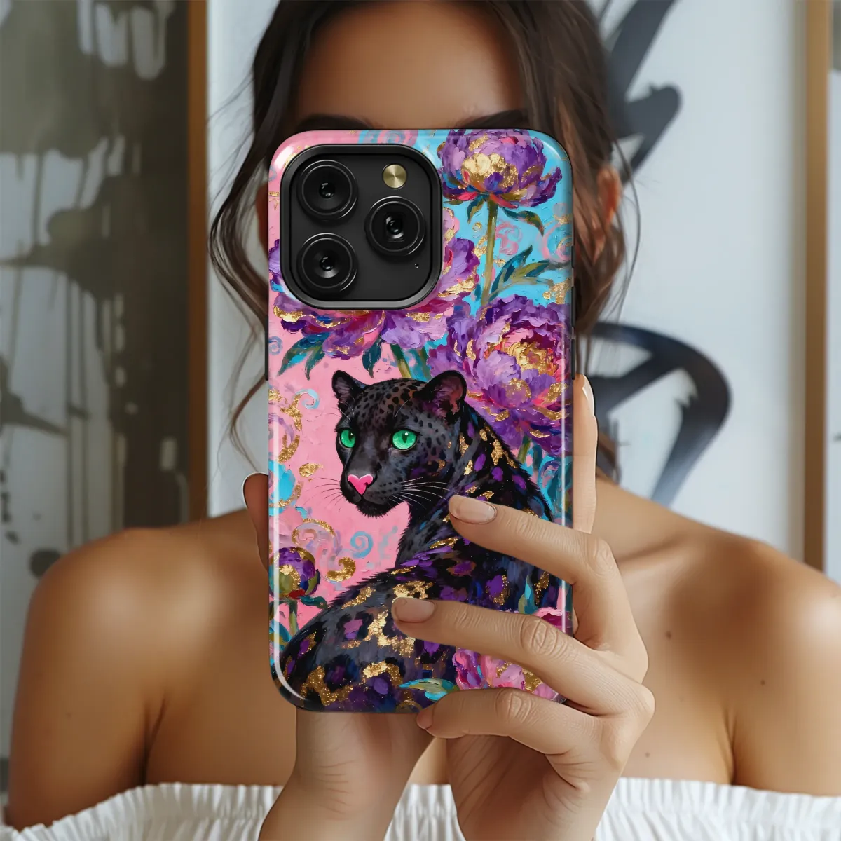 Embrace a bold, maximalist aesthetic with this stunning painterly design. The artwork features a magnificent black panther with captivating green eyes, set against a vibrant garden of lush purple and pink peonies. Lavish gold leaf accents are scattered throughout, catching the light on both the panther's coat and the flower petals, all rendered in a rich, textured style. The striking contrast of the deep black fur against the bright pink and turquoise background creates a truly unforgettable and artistic statement.