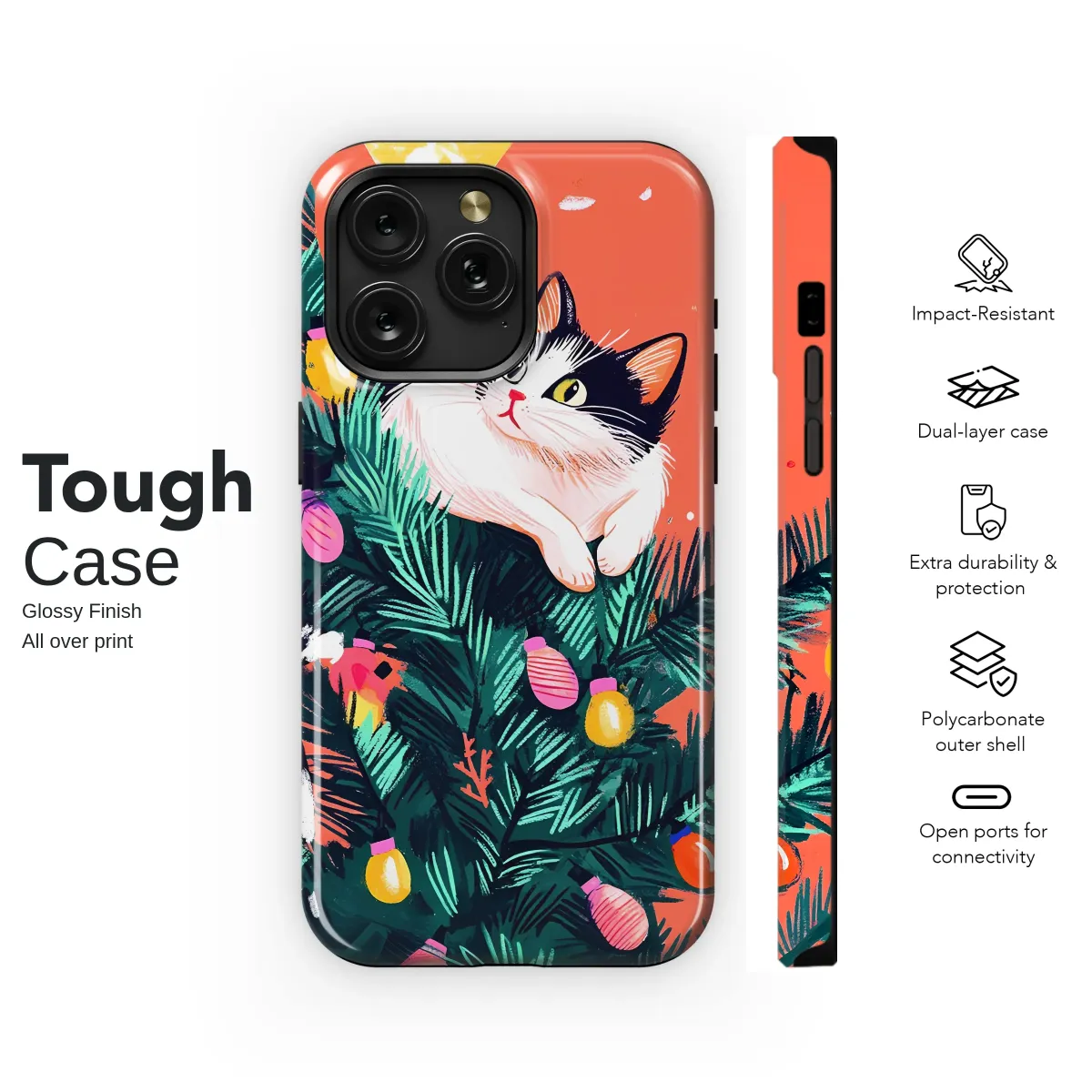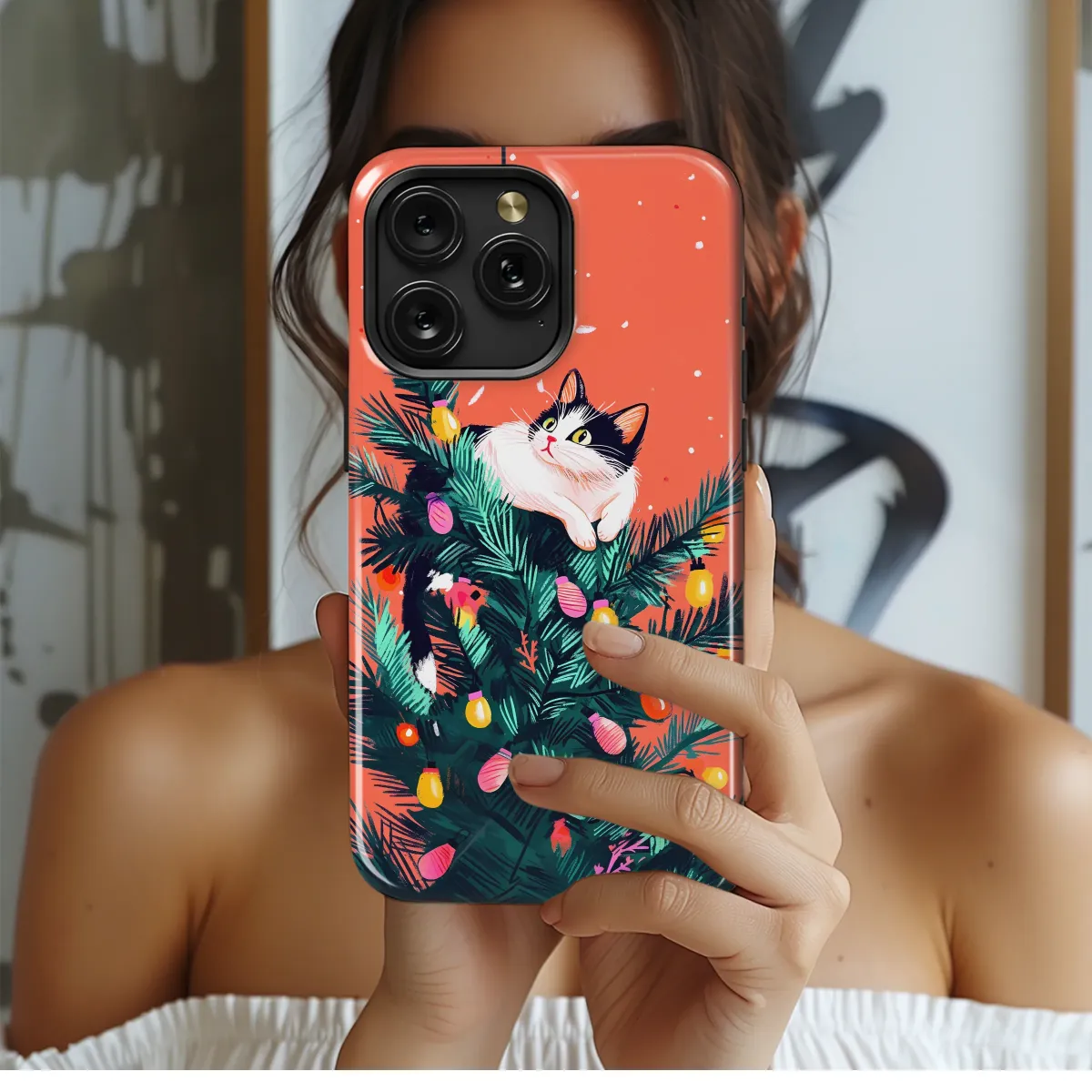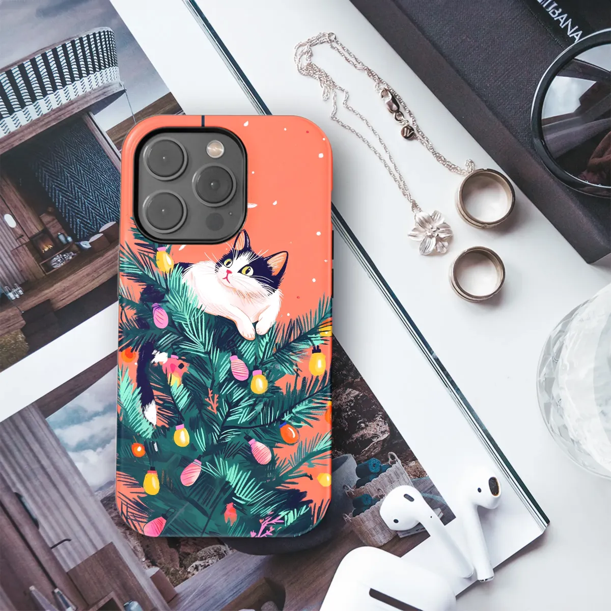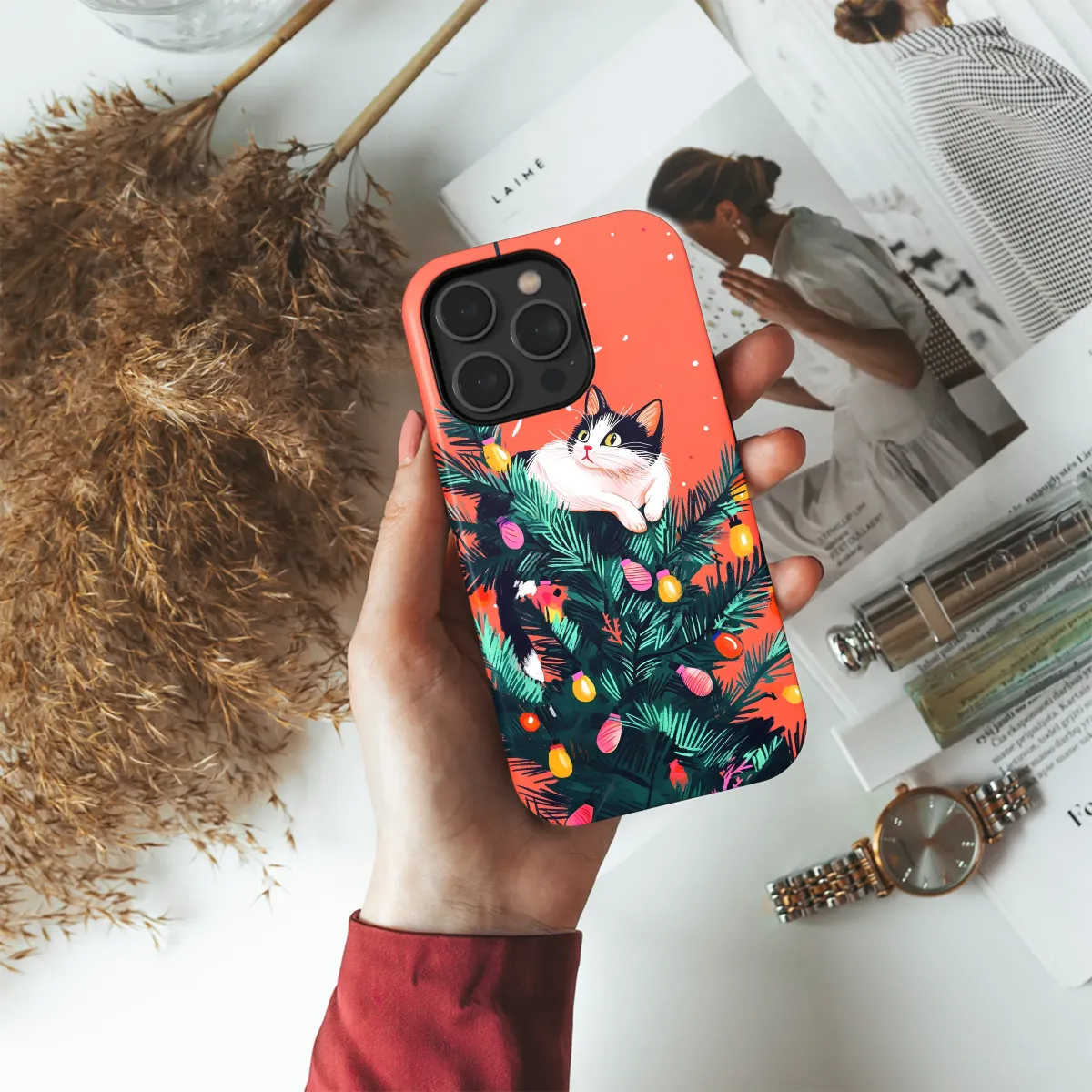 Whimsical Christmas Cat on Tree Illustrated Holiday Design Phone Case Cover for iPhone 17 Pro Max 16 15 13 Samsung S25 S24 Pixel 8832