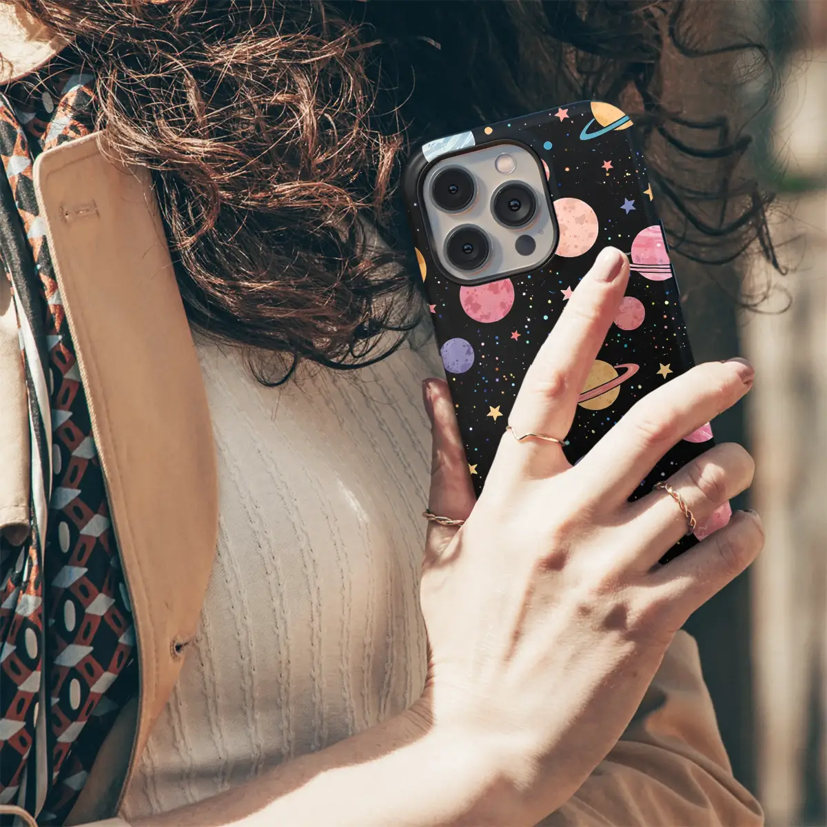 Hold a pocketful of cosmos and let your imagination wander through a whimsical, candy-colored galaxy every time you glance at your device. This enchanting celestial design is a love letter to the daydreamer, the star-gazer, and the adventurer in your soul. Against a deep, inky black canvas, a delightful universe comes to life with retro-style pastel planets in shades of dreamy pink, serene lavender, and cheerful mint green, each with unique, swirling textures that invite a closer look. A ringed Saturn floats gracefully by a marbled blue world, while a charming comet shoots past, all set within a confetti of rainbow stardust and sweet, simple stars twinkling in the void. This is more than just a protective charm for your tech; it's a piece of wearable art that tells a story of cosmic wonder and nostalgic fun, making your daily driver a true conversation starter. Perfect for anyone with a cute kawaii aesthetic, a love for all things space, or a deep passion for astronomy, this vibrant celestial pattern makes a wonderfully unique astrology gift or a special treat for yourself. Let your most essential companion reflect your vibrant personality and wrap your connection to the world in a durable, beautiful shield that’s truly out of this world. Carry this little universe with you and let it be a constant, magical reminder to always look up and dream.
