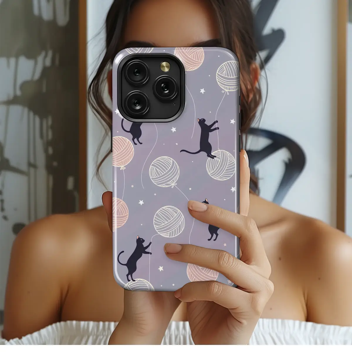 Let your imagination float away into a dreamy lavender sky with this enchanting piece of art for your most essential companion. In this whimsical world, sleek black cats playfully leap and climb, their curious eyes fixed on a magical sight: giant, cozy balls of yarn drifting like balloons. Each blush-pink and cream yarn ball floats weightlessly, their delicate strings held tight by mischievous paws against a celestial backdrop of twinkling white stars. This isn't just a design; it's a tiny, portable story of cottagecore charm and feline fantasy, a perfect blend of cozy comfort and magical adventure. It’s a daily dose of playful joy, transforming your tech into a unique conversation starter that showcases your love for all things cute, magical, and cat-related. Wrap your device in this adorable illustration, making it the perfect, thoughtful gift for the cat lover, knitter, or whimsical dreamer in your life who deserves a little extra magic to carry with them every day.