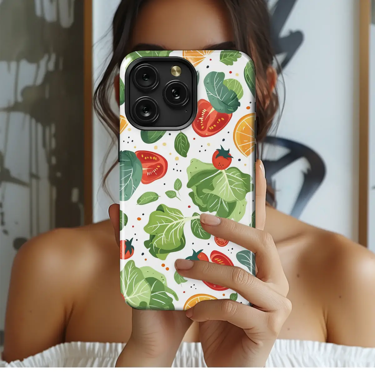 Carry the cheerful spirit of a sun-drenched farmer's market with you every day, beautifully captured in this vibrant and wholesome accessory for your most essential tech. Let your eyes dance across a playful pattern of crisp lettuce, juicy, sun-ripened tomatoes sliced to reveal their seeds, cool cucumbers, and zesty wedges of bright orange, all scattered like confetti over a clean, white canvas. Little green basil leaves and colorful specks add a touch of whimsy, creating a design that feels both modern and wonderfully organic. This artist-designed botanical print is a celebration of healthy living and the simple joy of fresh food, making it the perfect foodie gift or a special treat for yourself. Meticulously crafted to be a slim yet durable shield for your device, it adds a burst of personality without the bulk, transforming your everyday companion into a piece of wearable art. It's an ideal expression for the dedicated vegan, the passionate gardener, or anyone who adores a cute, cottagecore aesthetic. Let this delightful garden harvest design wrap your tech in the feeling of a perfect summer picnic, serving as a constant, colorful reminder to find beauty in nature's bounty and savor life's simple pleasures.