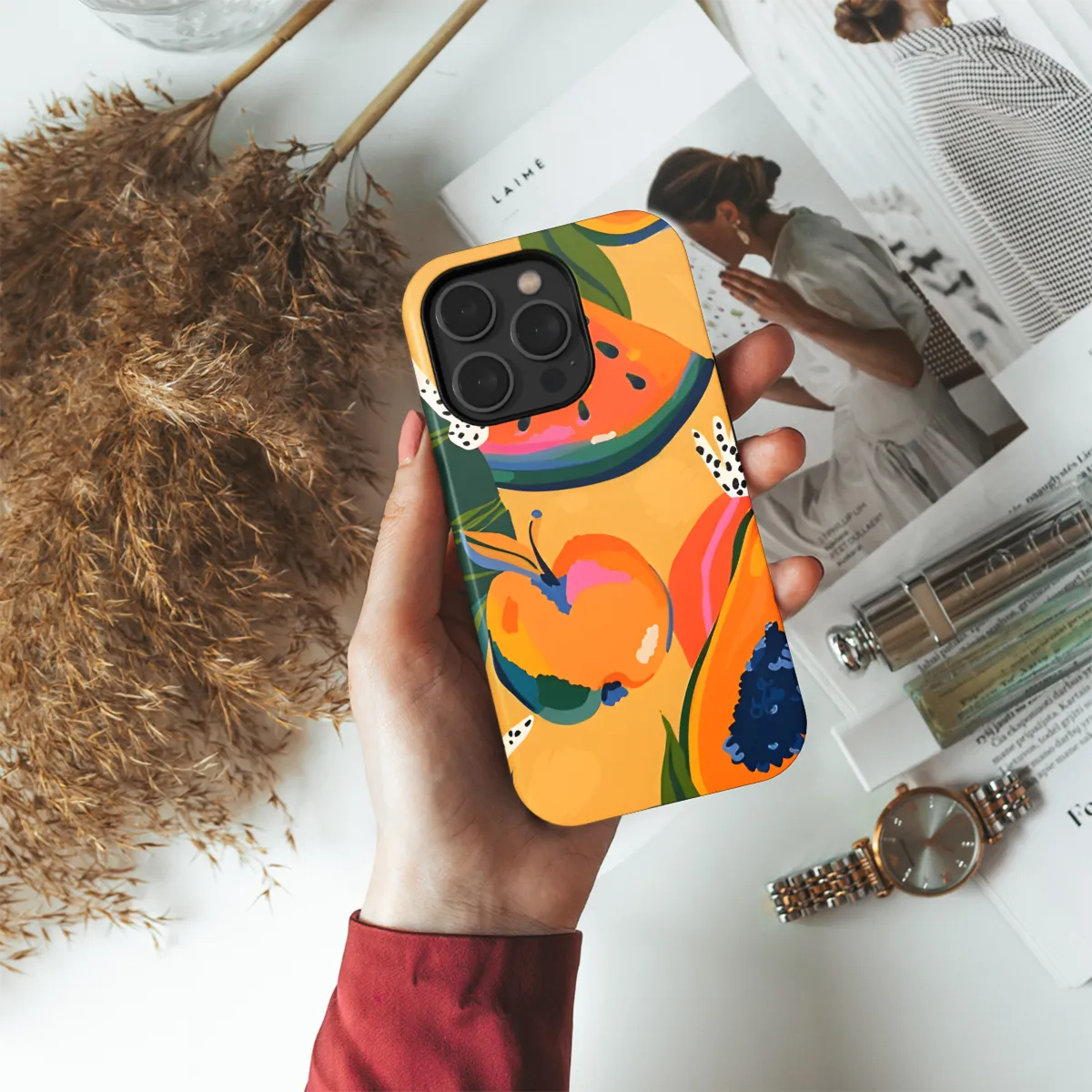 Dive into a whimsical realm where vibrant hues dance across your phone. Adorned with an abstract burst of fruity and floral patterns, this phone case is a vibrant masterpiece that will transform your device into a work of art. Its dynamic design captures the essence of nature's abundance, creating a mesmerizing canvas for your daily essentials. Each brushstroke and swirl is a testament to the boundless creativity that exists within.