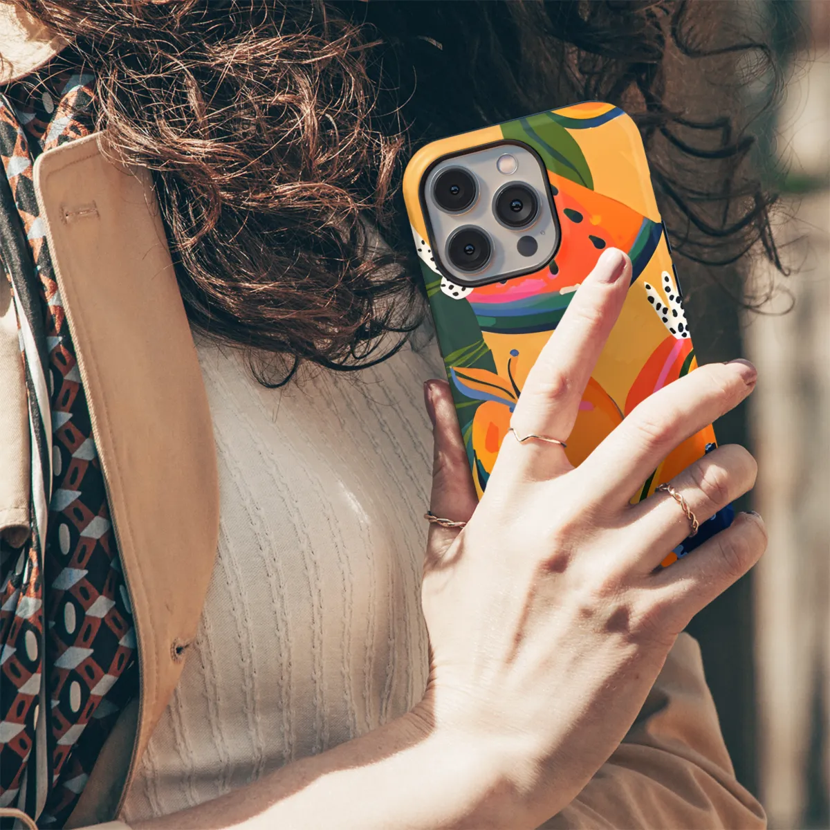 Dive into a whimsical realm where vibrant hues dance across your phone. Adorned with an abstract burst of fruity and floral patterns, this phone case is a vibrant masterpiece that will transform your device into a work of art. Its dynamic design captures the essence of nature's abundance, creating a mesmerizing canvas for your daily essentials. Each brushstroke and swirl is a testament to the boundless creativity that exists within.